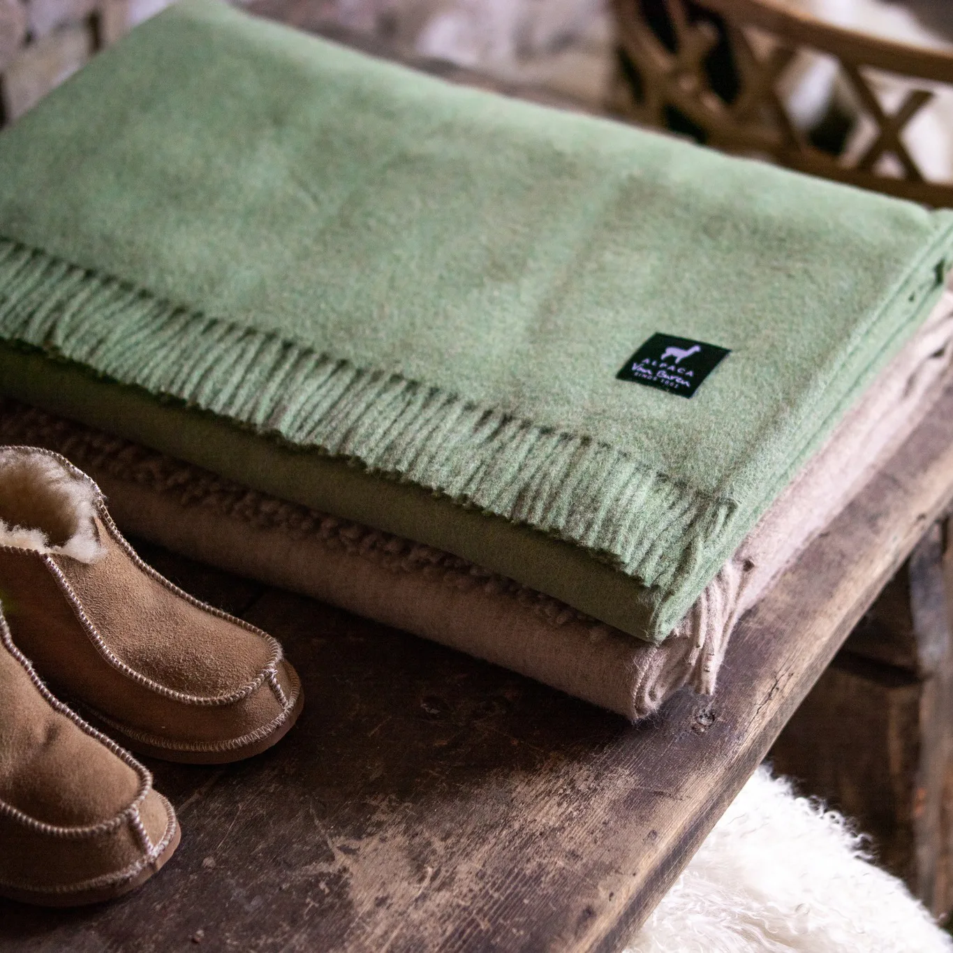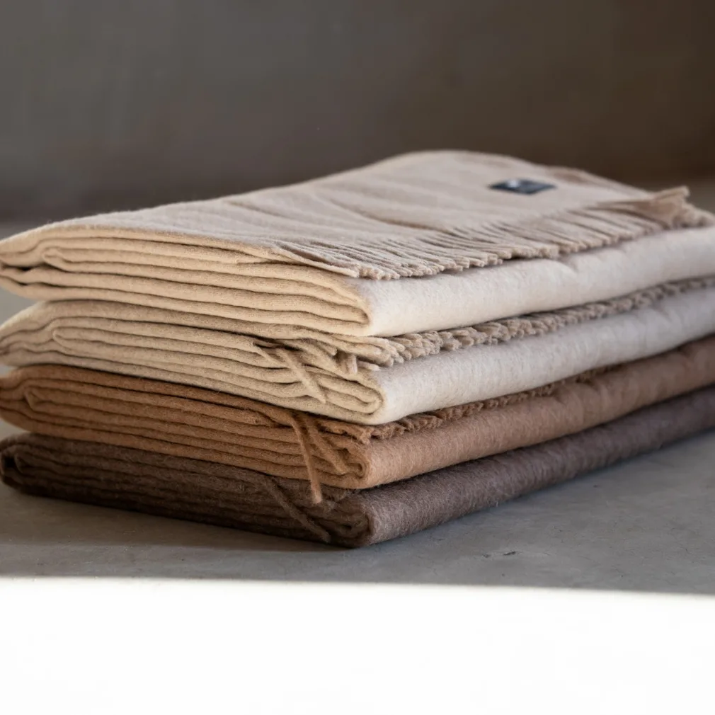 De grote (2×1,5m) Alpaca plaids zijn van 55% alpacawol / 30% wol / 15% synthetisch.