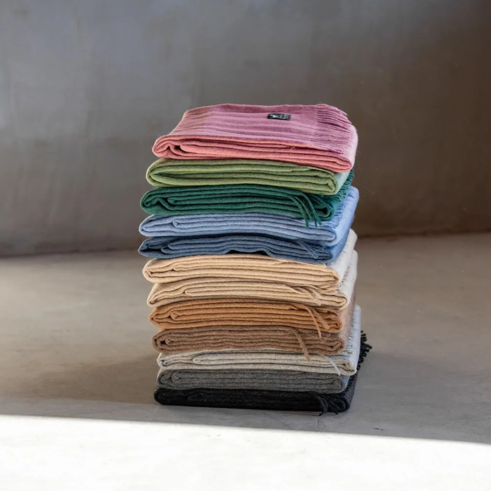 De grote (2×1,5m) Alpaca plaids zijn van 55% alpacawol / 30% wol / 15% synthetisch.