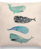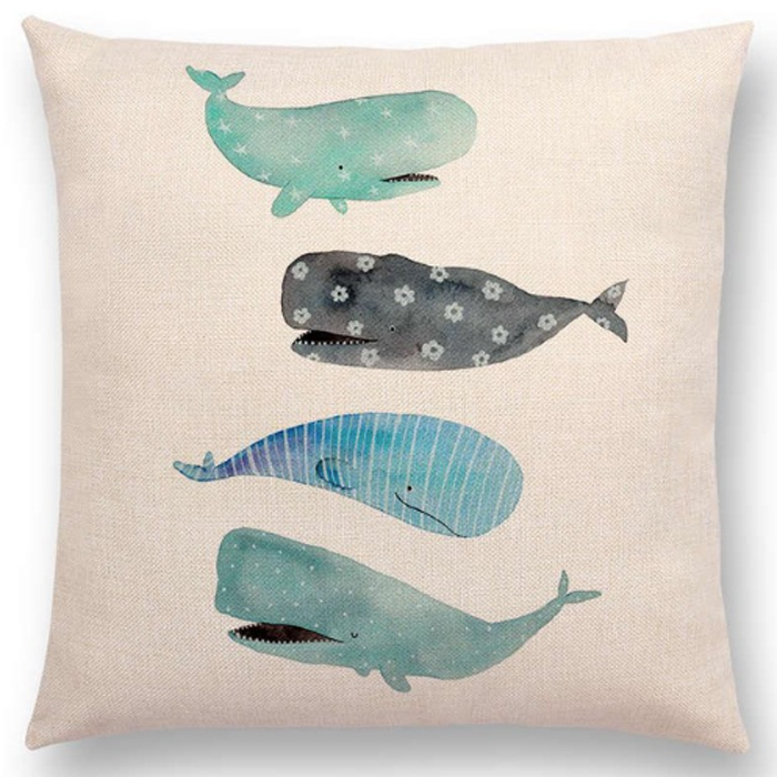 De kussenhoes is vervaardigd van canvas en katoen en is aan 1 kant bedrukt met een print van vrolijke walvissen. De achterkant van deze kussenhoes is effen naturel.