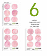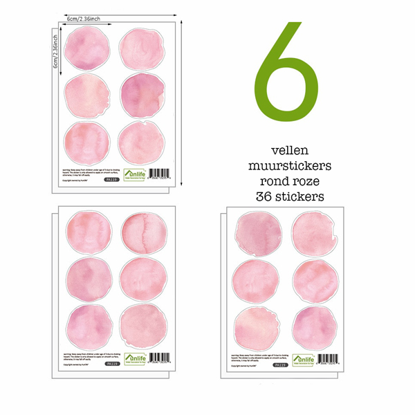 Je ontvangt een pakket van 6 vellen muurstickers, dus 36 ronde stickers in totaal.