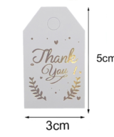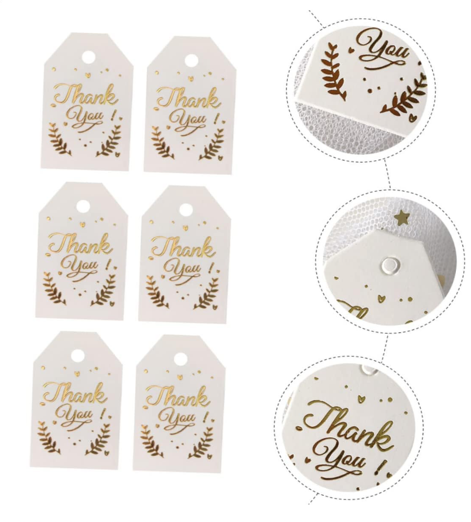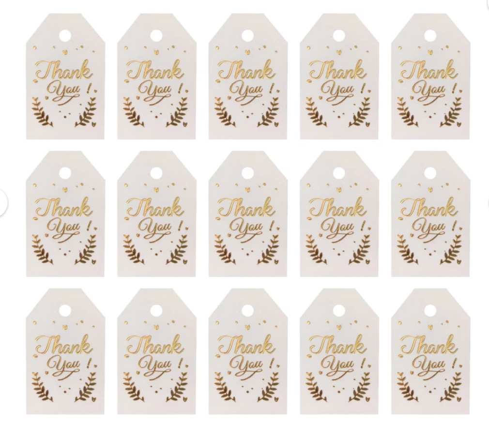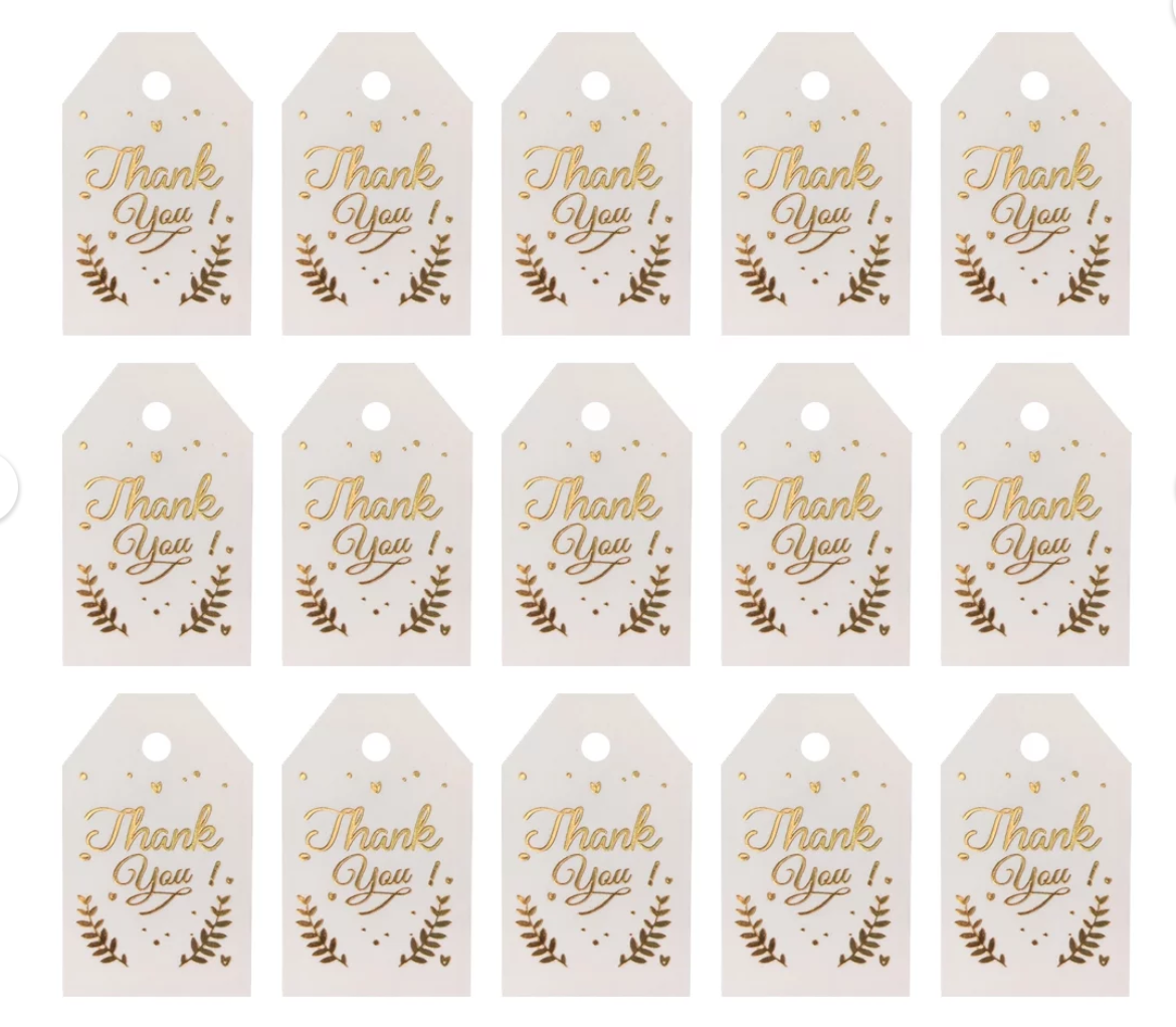 Onze labels zijn gemaakt van stevig karton en voorzien van een gestanst gaatje, waardoor ze gemakkelijk aan een geschenk kunnen worden bevestigd. De gouden bedrukking met de boodschap ‘Thank You’ voegt een vleugje elegantie toe aan je gebaar van waardering.