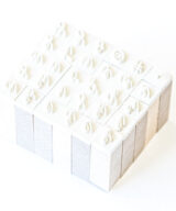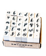 Je ontvangt een set van 30 verschillende stempels, met het alfabet in schuinschrift, en 4 leestekens : @, &, . en #