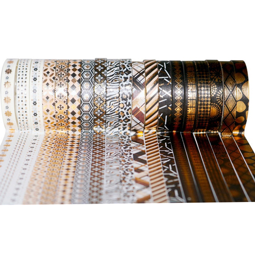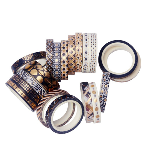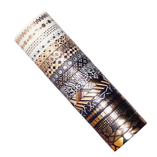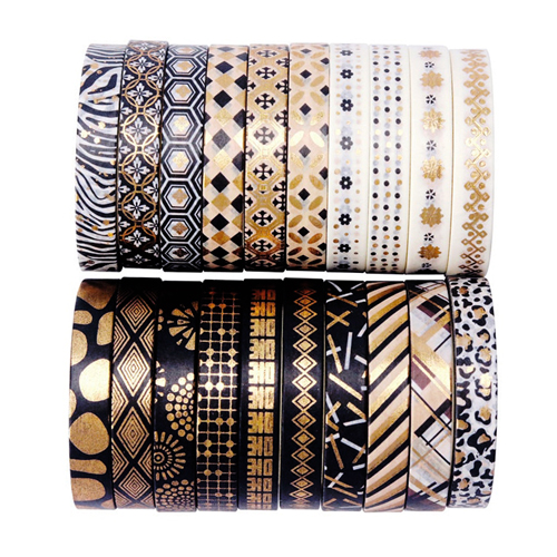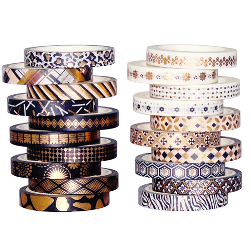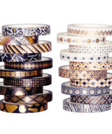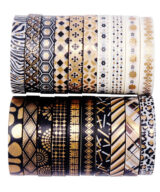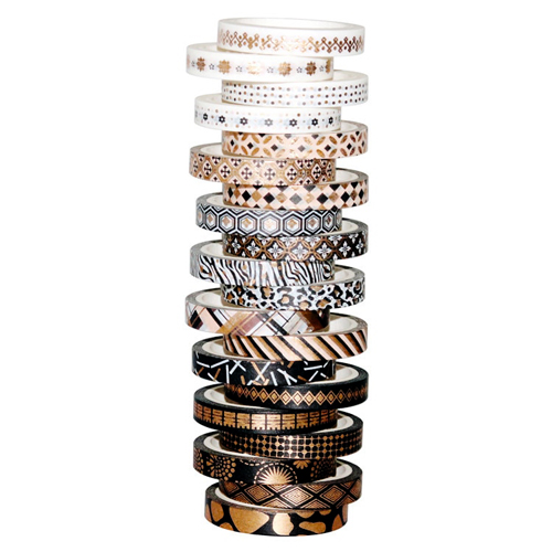Dit prachtige set van 20 verschillende rollen washi tape in de kleuren zwart, wit, goud en rosè-goud is glanzend en heeft een luxe uitsraling.