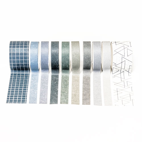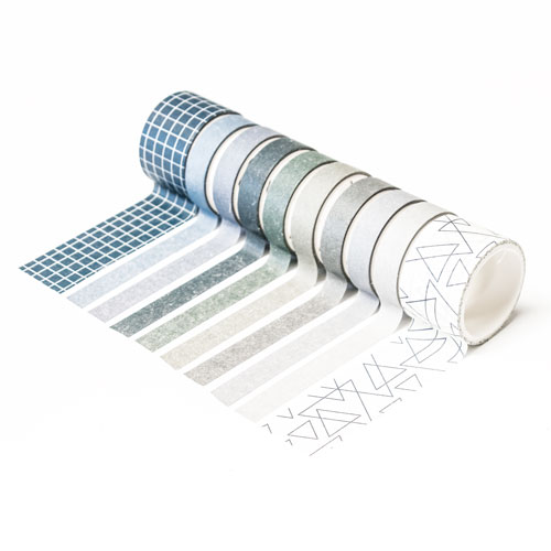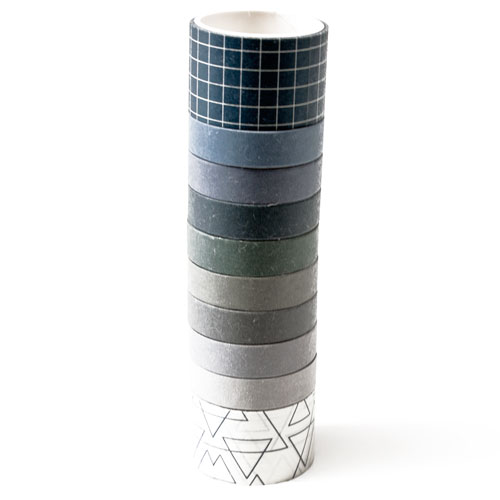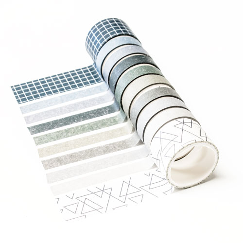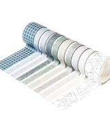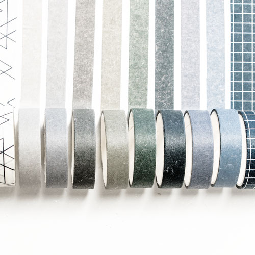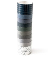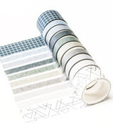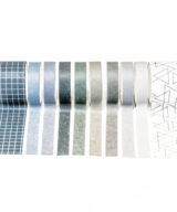 Deze set washi tape komt met de kleuren blauw, groen, grijs en wit