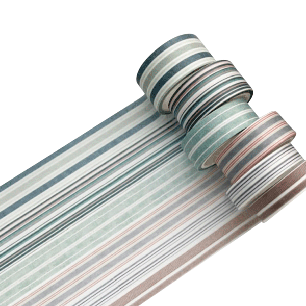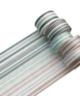 Je ontvangt 6 rollen beschrijfbare washi tape met een lengte van 5 meter met elk een ander strepen-dessin in verschillende kleuren.