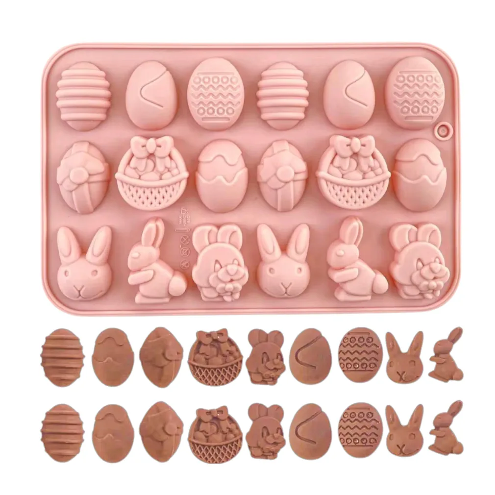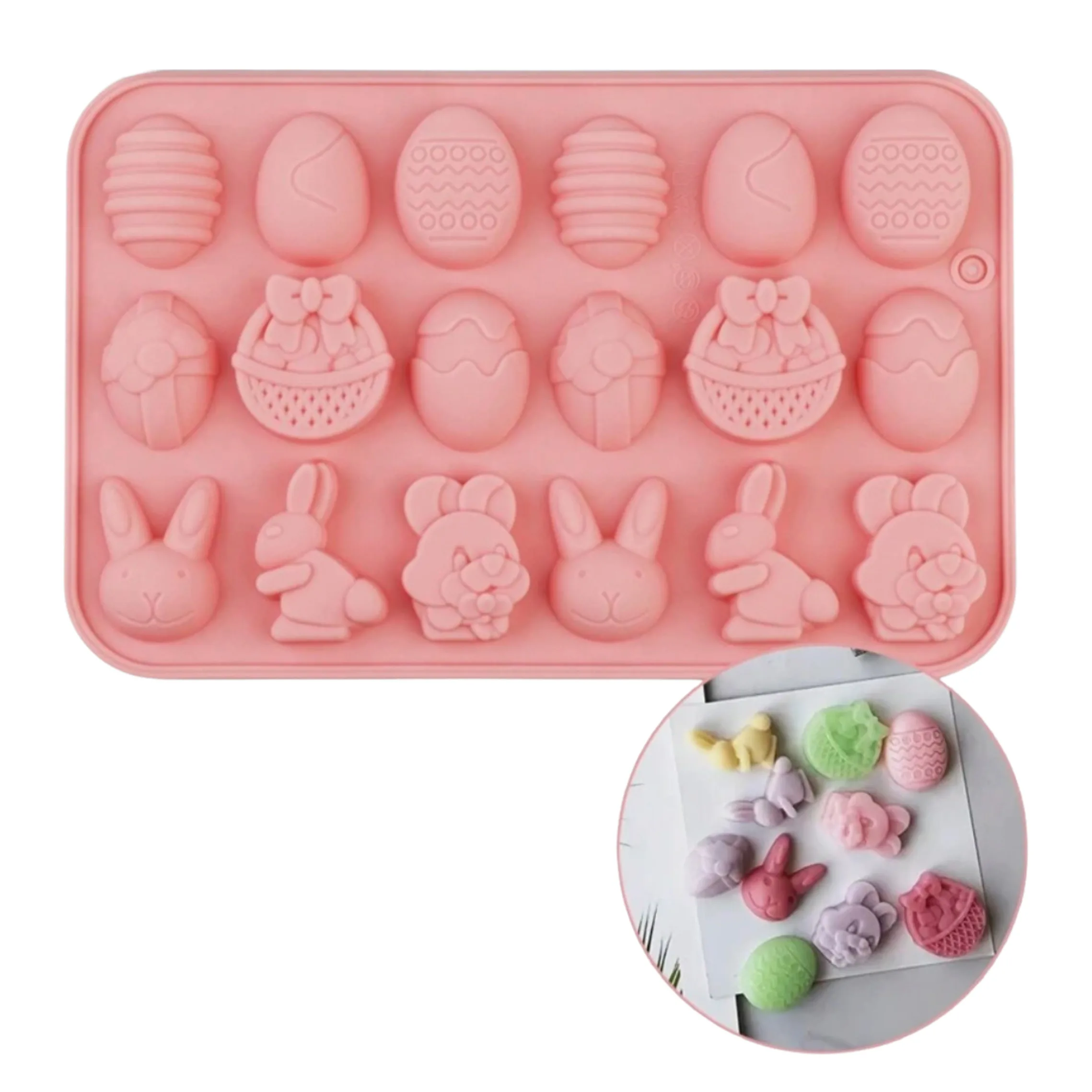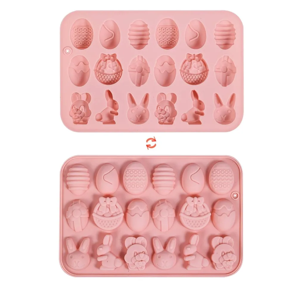 Maak Pasen extra leuk en creatief met deze siliconenvorm met 18 holtes! Perfect voor het maken van chocolaatjes, paaseieren, konijntjes, fondantdecoraties, kleine koekjes en meer. Deze BPA-vrije siliconen mal is ideaal voor bakken, knutselen én koken met kinderen. Dankzij het buigbare en flexibele ontwerp haal je jouw creaties er moeiteloos uit zonder te breken.