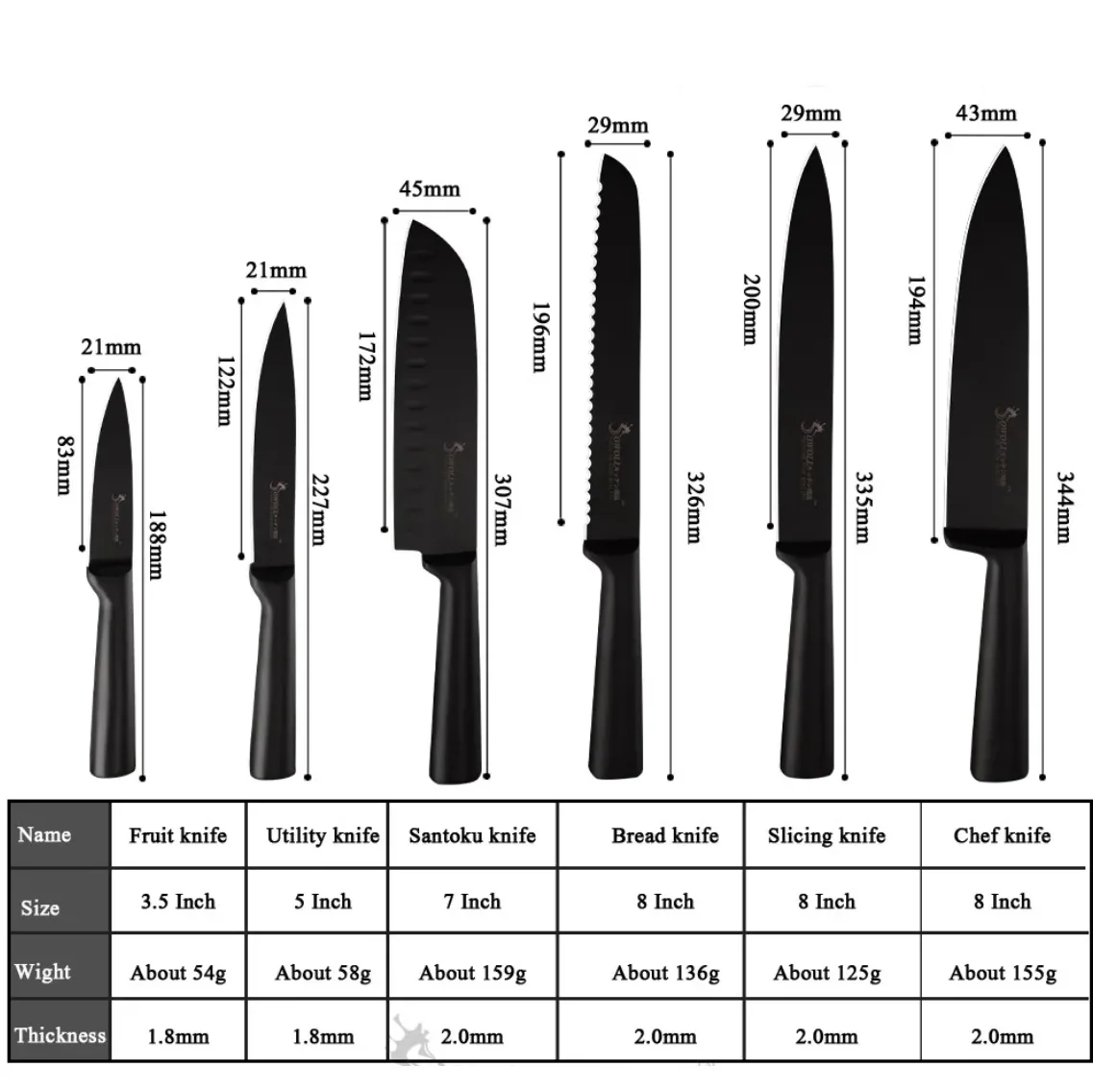 - 1 Fruitmes ( lengte: 18,8 cm, snijlengte: 8,9 cm – gewicht 54 gram)