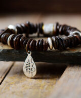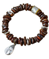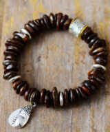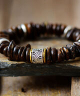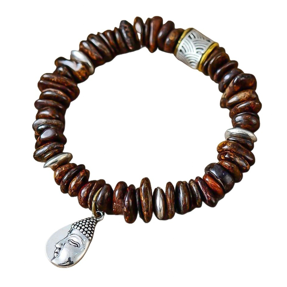 Deze prachtige vegan armband is handgemaakt en voorzien van bruin elastisch koord, kralen vervaardigd uit bronziet, een zilverkleurige bedel met een Buddha hoofd en een zilverkleurige grote kraal. De armband is een mooie aanvulling op ieder heren outfit!
