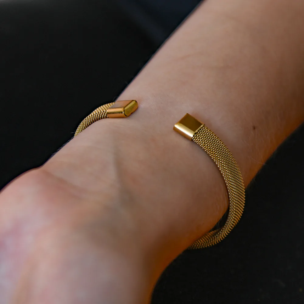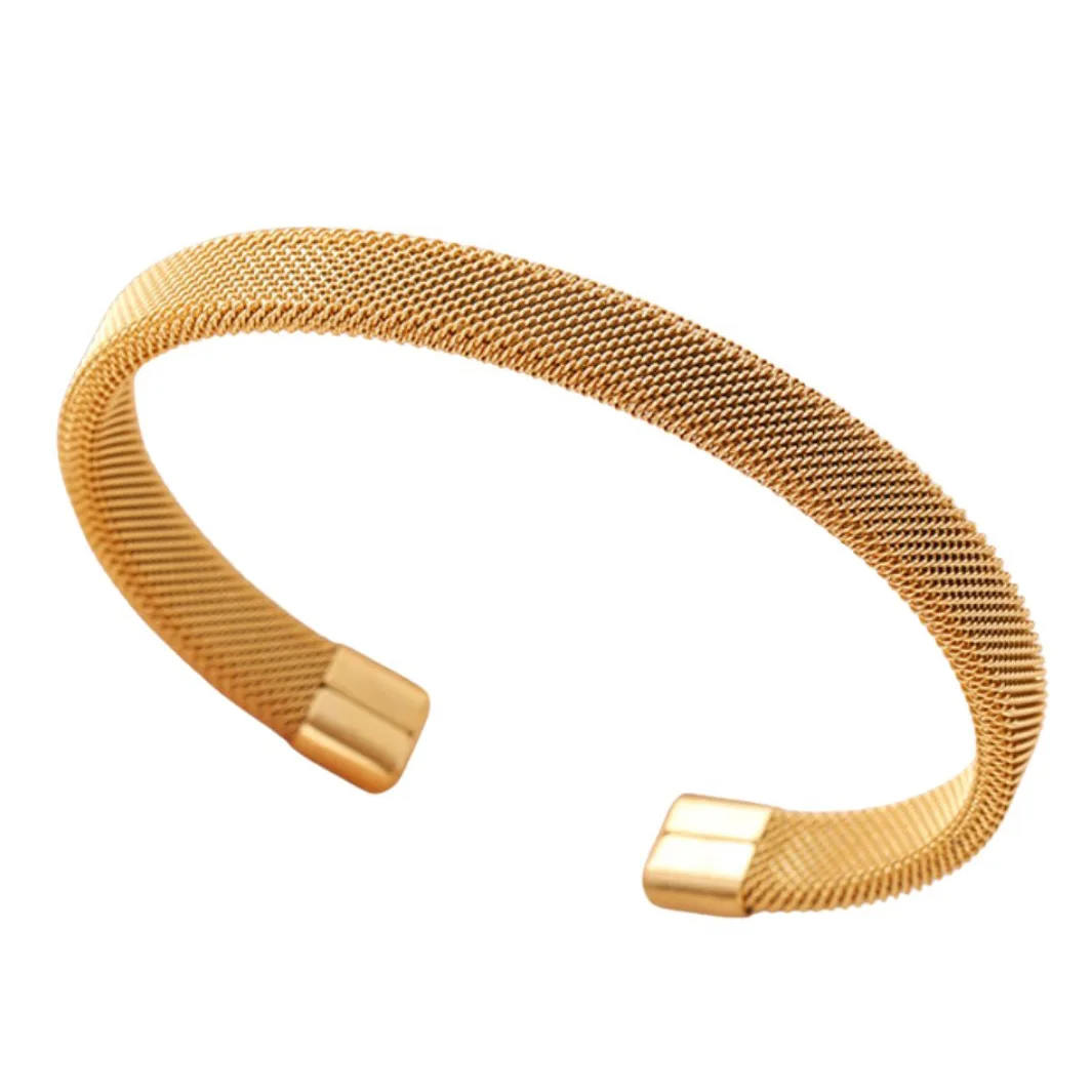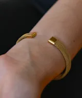 Deze open damesarmband is licht buigbaar, waardoor hij past om praktisch elke pols. De goudkleurige tint voegt een vleugje luxe toe aan elke outfit, terwijl de bangle-stijl zorgt voor een eigentijdse en verfijnde uitstraling. Het chique ontwerp is perfect voor vrouwen die streven naar een stijlvolle en vrouwelijke look.