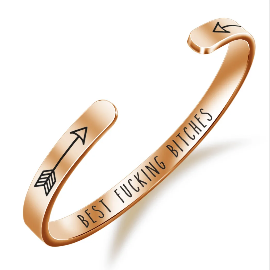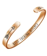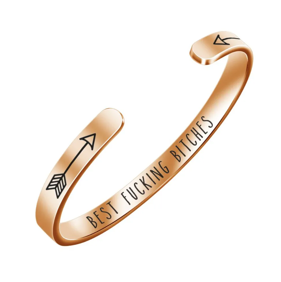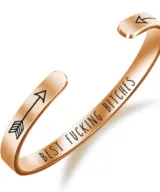 Deze prachtige armband is gemaakt van hoogwaardig roestvrij staal, waardoor hij duurzaam en langdurig is. De ingegraveerde tekst aan de binnenzijde: “Best Fucking Bitches” in combinatie met 2 pijlen aan de buitenzijde maakt hem extra speciaal en grappig.