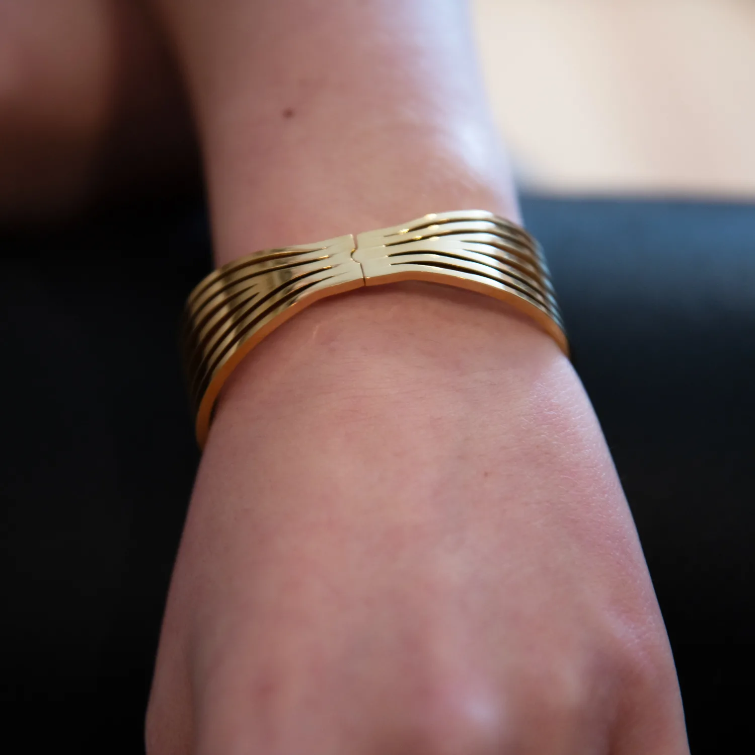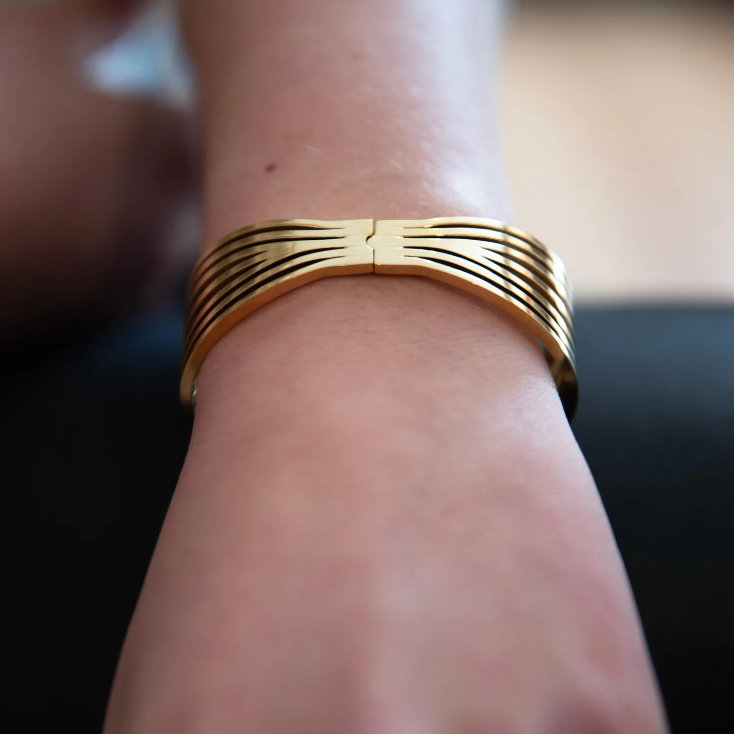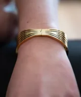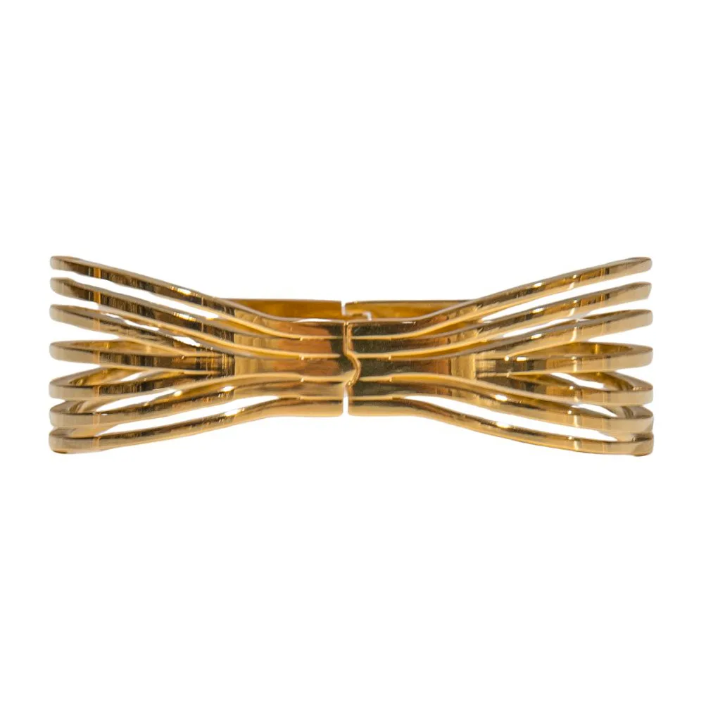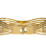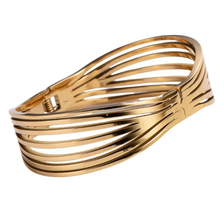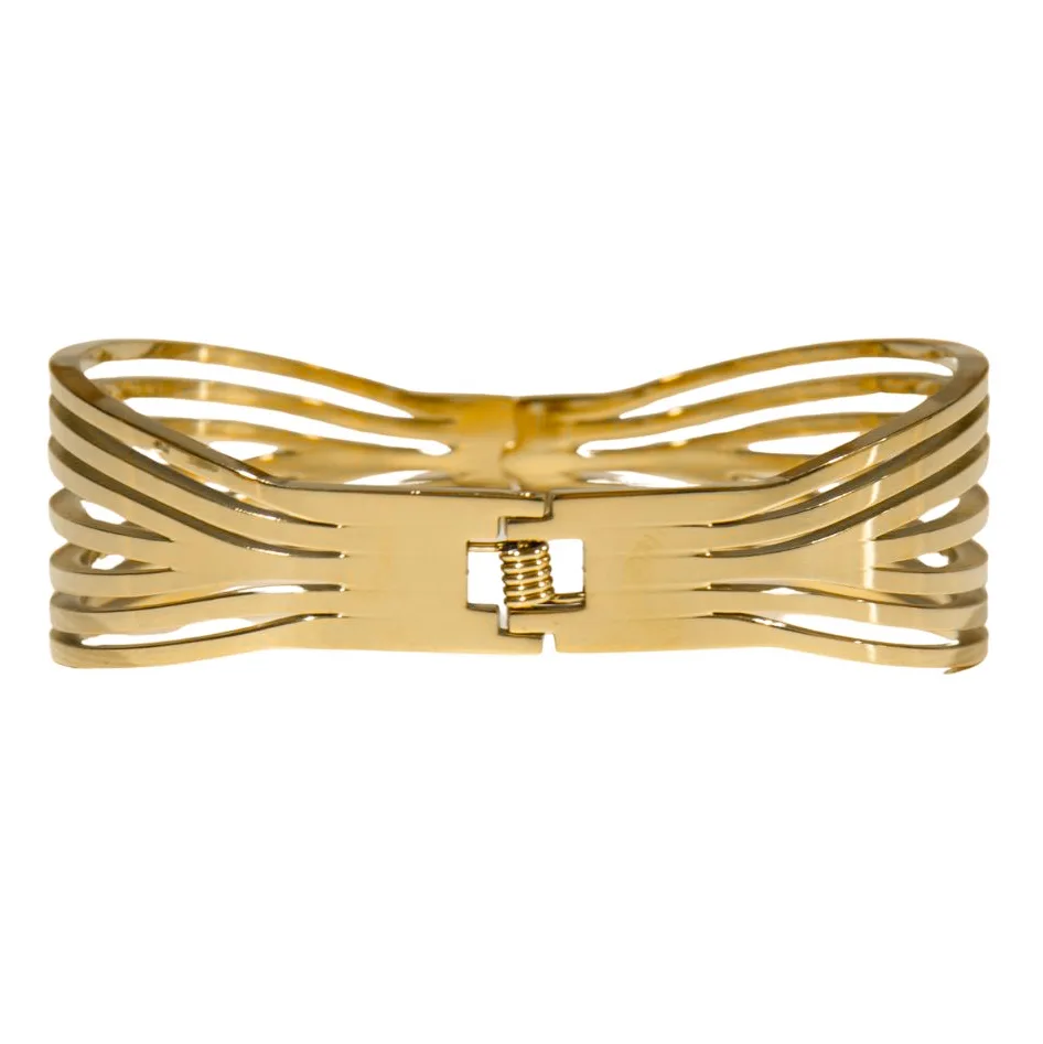 Deze armband heeft aan de achterzijde een scharniersluiting, waardoor de damesarmband gemakkelijk is te openen en te sluiten. De goudkleurige tint voegt een vleugje luxe toe aan elke outfit, terwijl de bangle-stijl zorgt voor een eigentijdse en verfijnde uitstraling. Het chique ontwerp is perfect voor vrouwen die streven naar een stijlvolle en vrouwelijke look.