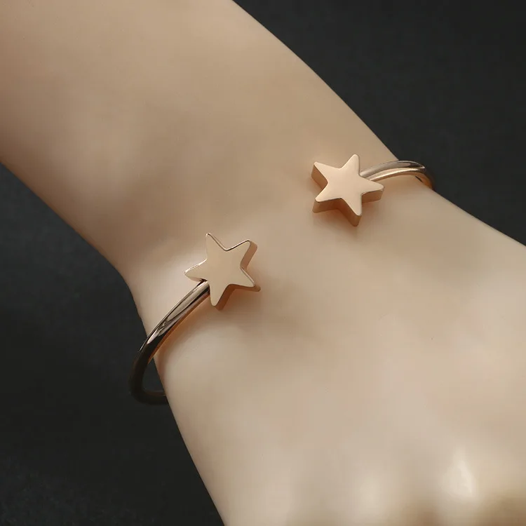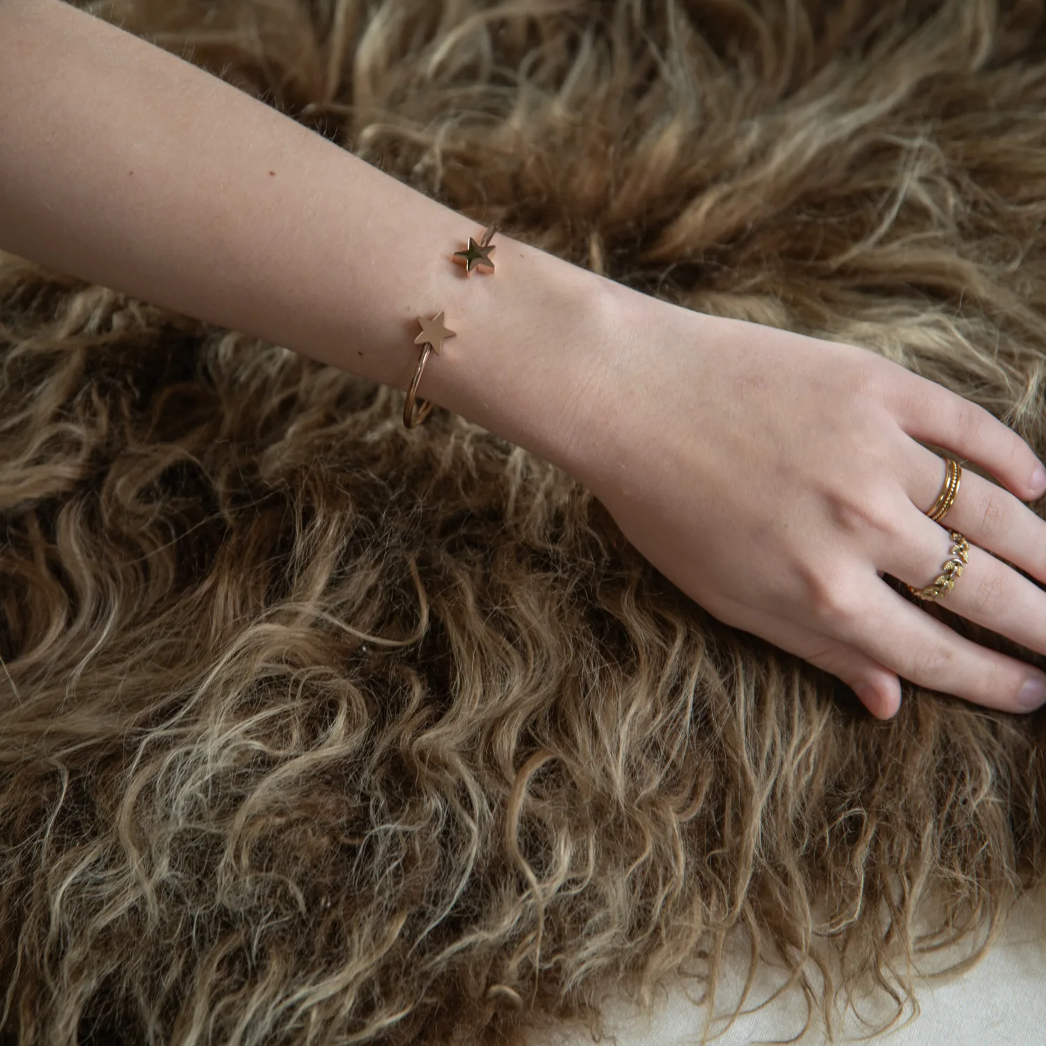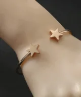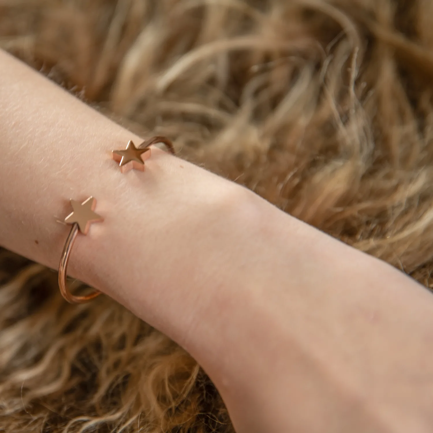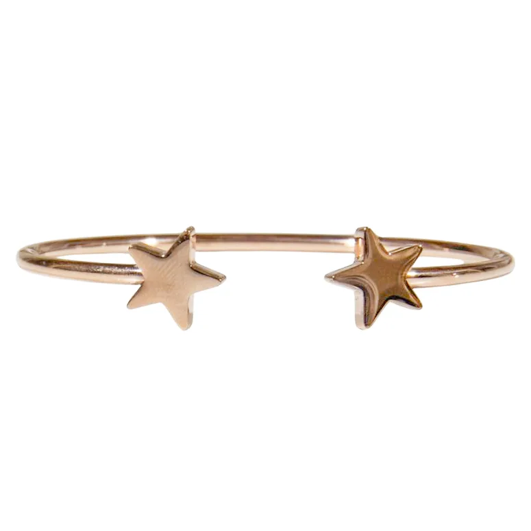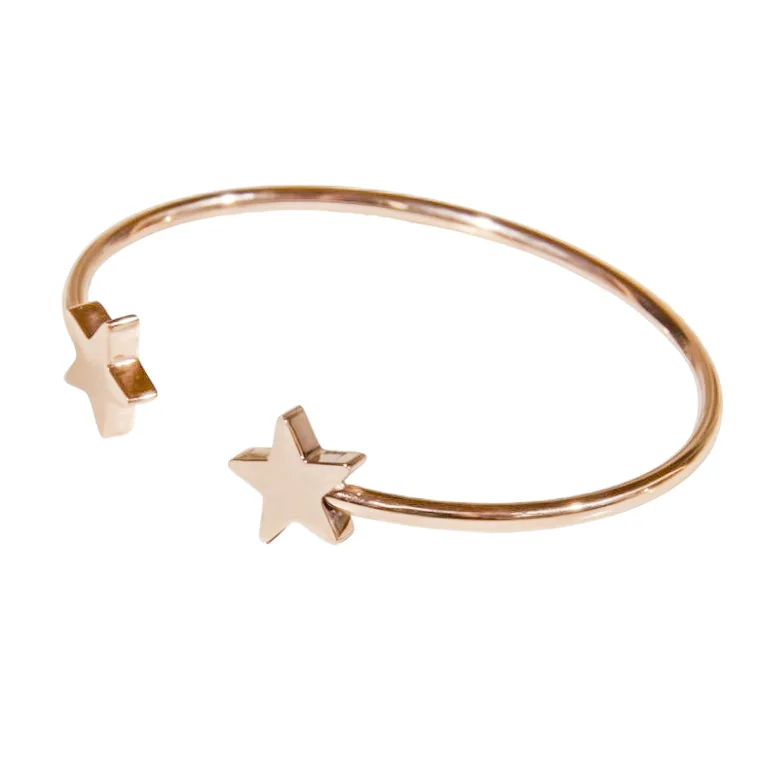 Ontdek de tijdloze elegantie van de bangle Stars Rosè Goud- een schitterende toevoeging aan elke sieradencollectie. Vervaardigd uit hoogwaardig goud plated roestvrij staal en met een verfijnde gouden plated afwerking, straalt deze dames armband een tijdloze glamour uit.