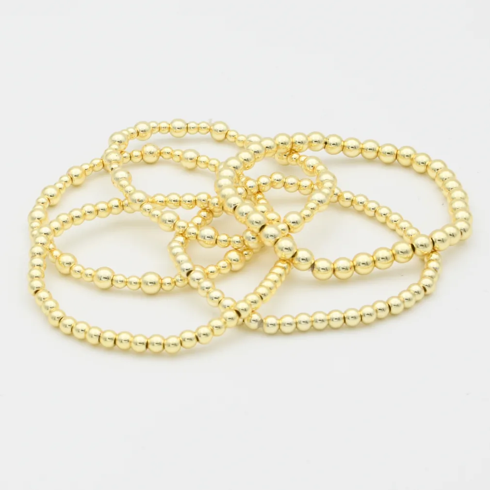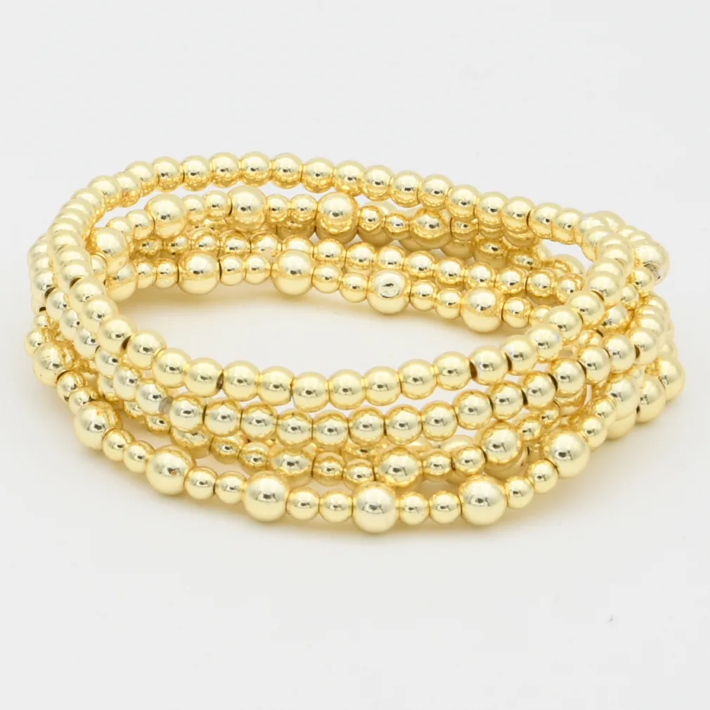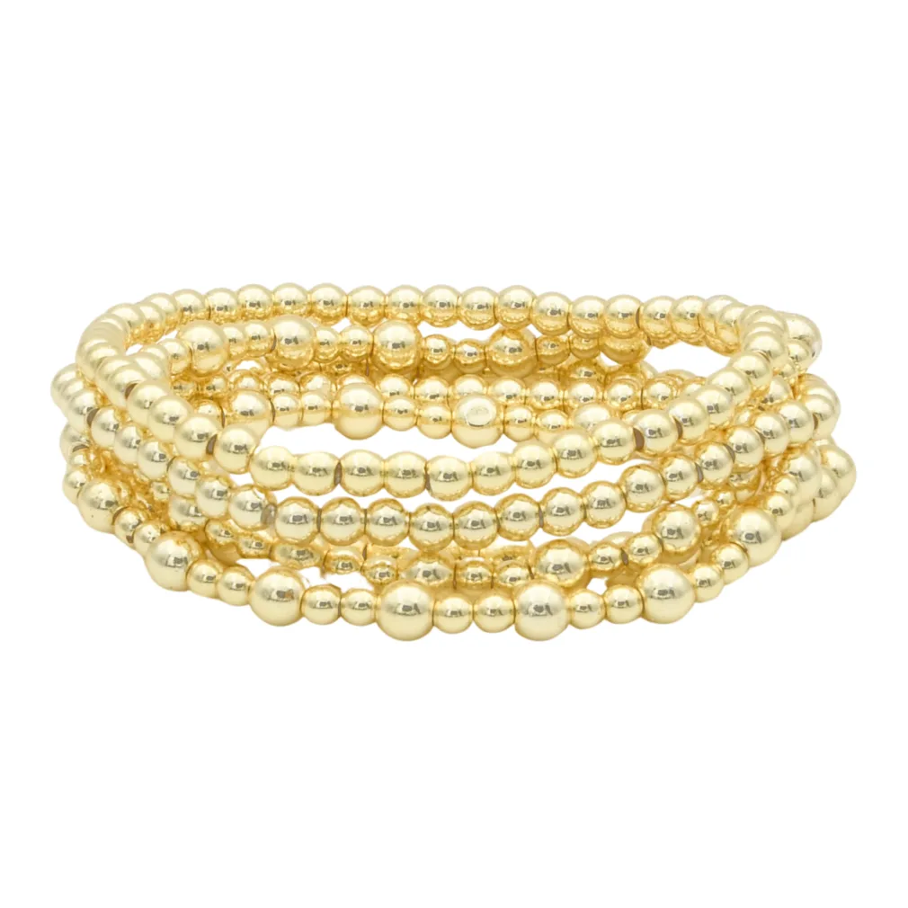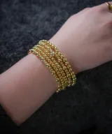 Deze set van 5 elastische armbanden in goud is het perfecte accessoire voor elke gelegenheid. De armbanden zijn gemaakt van stainless steel en hebben een luxueuze gold plated afwerking. Elke armband is subtiel voorzien van gouden kralen, die een feestelijke en verfijnde uitstraling bieden. Of je nu een feestelijke gelegenheid hebt of je dagelijkse outfit wilt opvrolijken, deze set van 5 armbanden voegt direct glamour toe. Perfect voor wie van goud houdt en op zoek is naar een veelzijdige, elegante toevoeging aan hun sieradencollectie.