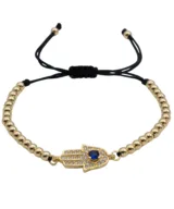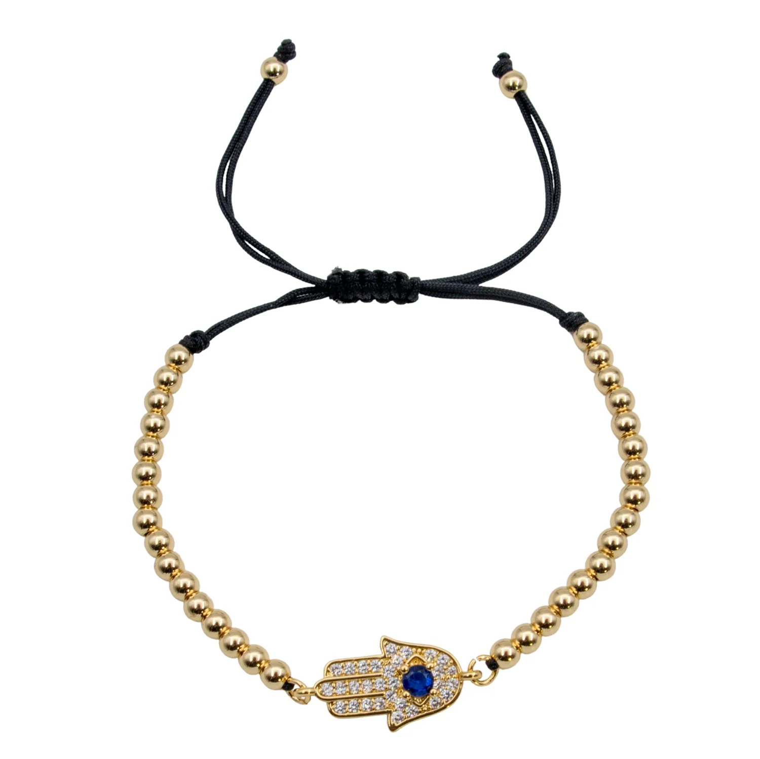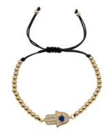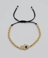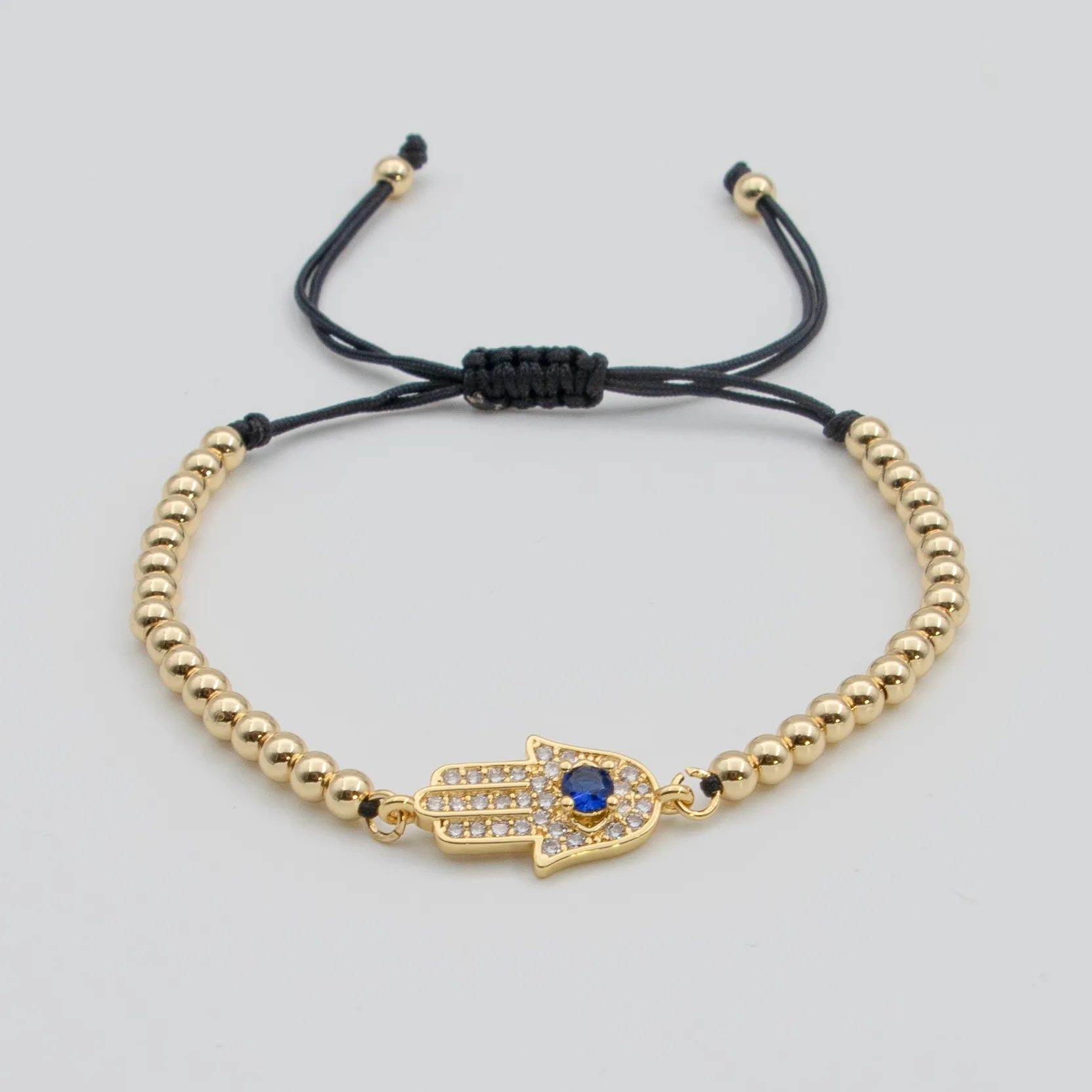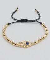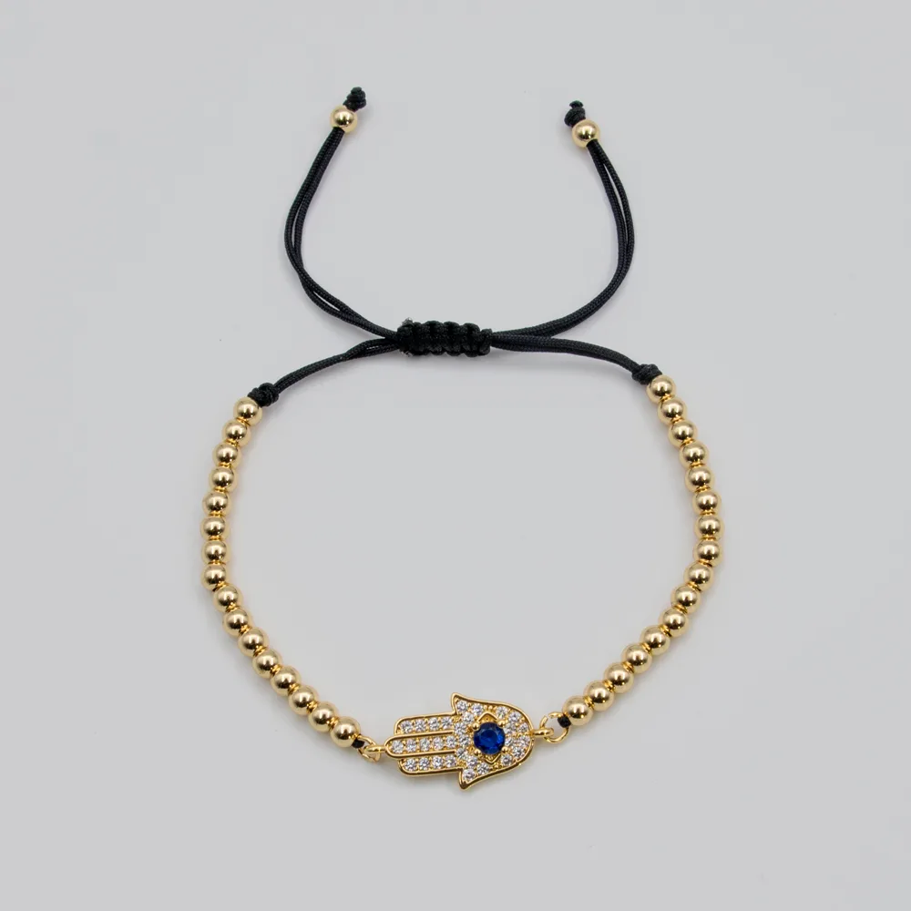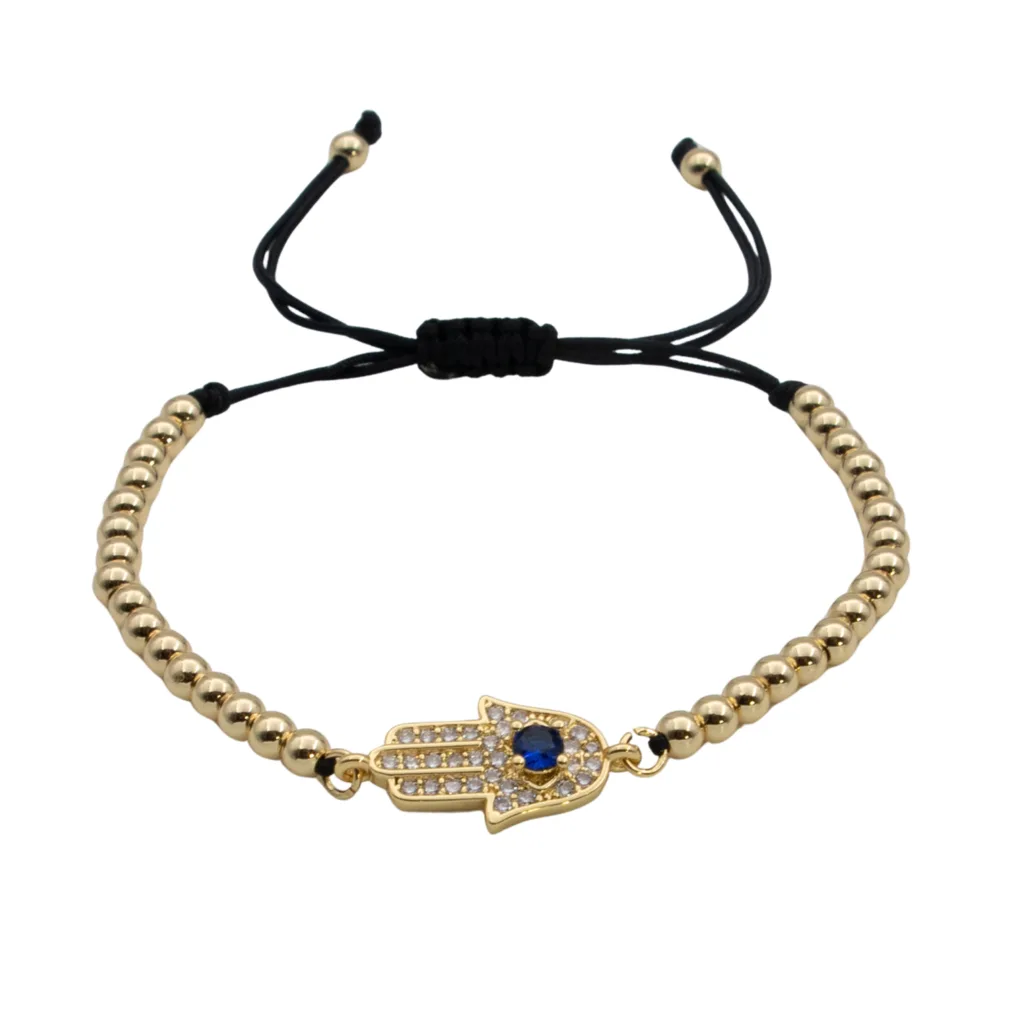 Maak je outfit compleet met deze verfijnde damesarmband! De armband is voorzien van fijne kraaltjes en een schitterende blauwe zirkoon steen, die een stijlvolle en verfijnde uitstraling geeft. Het goudkleurige Hamsa handje staat centraal, een symbool van bescherming en geluk. Deze armband is bovendien verstelbaar, zodat hij perfect om elke pols past.