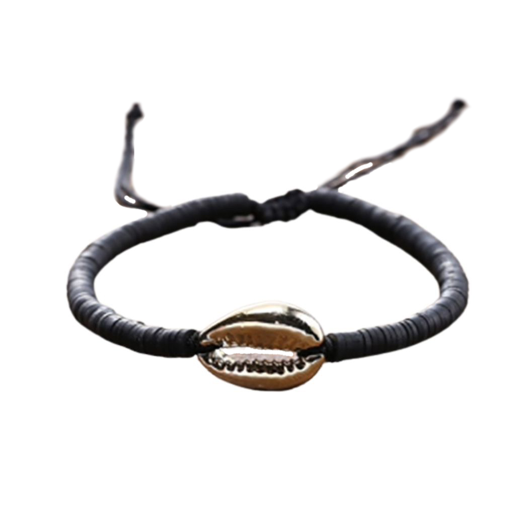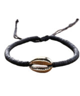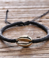 Deze prachtige armband is handgemaakt en voorzien van zwarte kleine ronde kralen en met een goudgekleurde natuurlijke schelp op stevig koord.