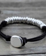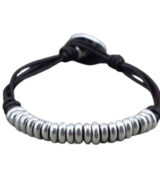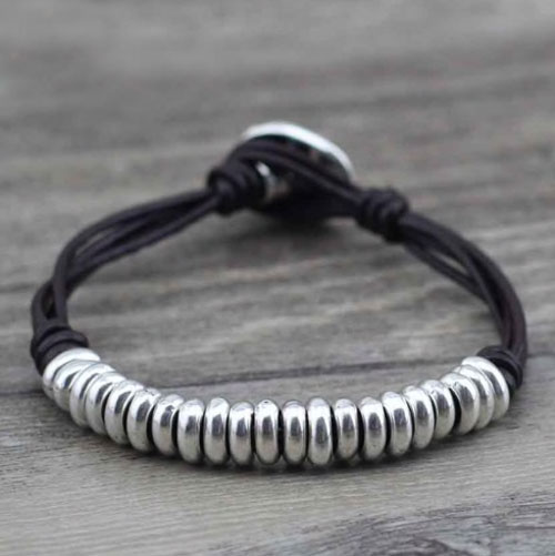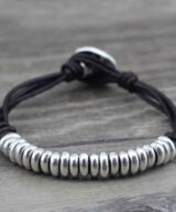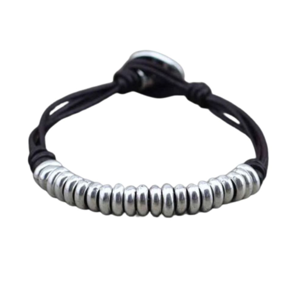 Deze prachtige handgemaakte armband is vervaardigd van geweven leer en zilverkleurige zinklegering kralen. Vanwege het tijdloze design past hij perfect bij iedere dames of heren outfit! Door de knoopsluiting is deze stoere armband gemakkelijk en comfortabel in gebruik. De handgemaakte armbanden zijn vanwege de hypoallergene eigenschappen ideaal voor mensen met een gevoelige huid en wie last heeft van metaalallergie. Deze handgemaakte armbanden zijn stuk voor stuk uniek!