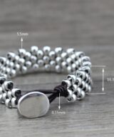 Deze prachtige handgemaakte armband is vervaardigd van geweven leer en zilverkleurige zinklegering kralen. Steel de show met deze armband om de pols. Door de knoopsluiting is deze stoere armband gemakkelijk en comfortabel in gebruik. De handgemaakte armbanden zijn vanwege de hypoallergene eigenschappen ideaal voor mensen met een gevoelige huid en wie last heeft van metaalallergie. Deze handgemaakte armbanden zijn stuk voor stuk uniek!