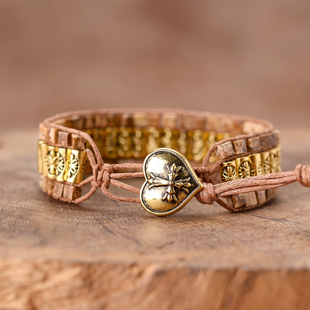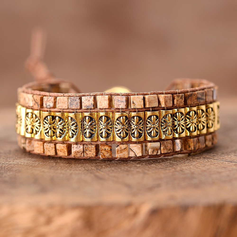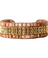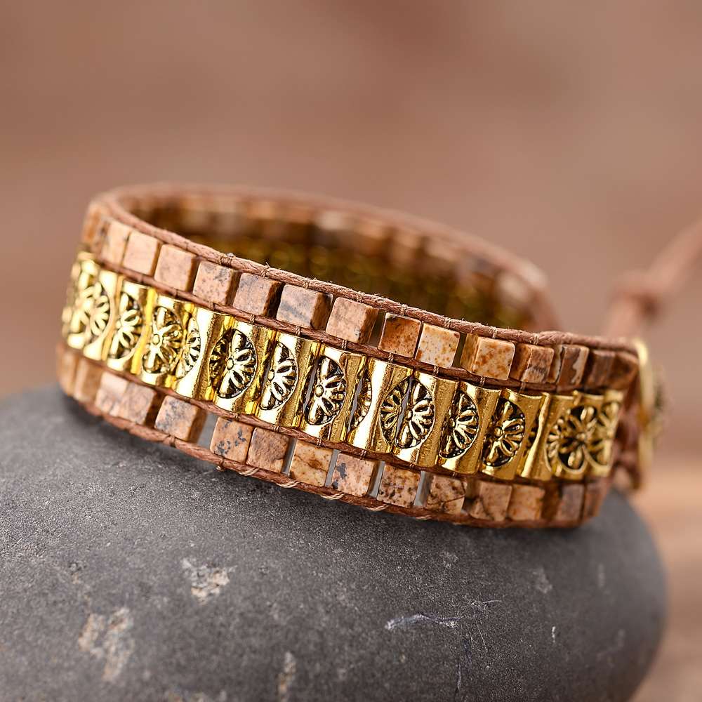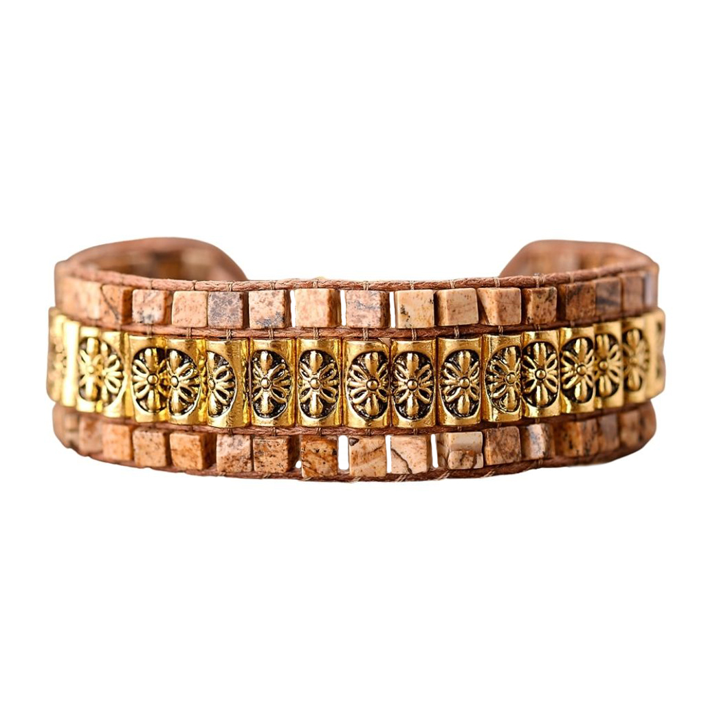 Deze prachtige vegan wikkelarmband is voorzien van lichtbruin vegan waxcord, bruine regaliet Jaspis edelstenen en goudkleurige kralen met een mooie bloem . Het koord van de armband heeft 3 knoopsluitingen, dus one size fits all! Je ontvangt dit trendy sieraad in een luxe geschenkdoosje met het logo van Marama.