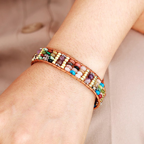 De armband is naast natuurstenen voorzien van verschillende kralen in o.a. de kleuren, turquoise en goud.