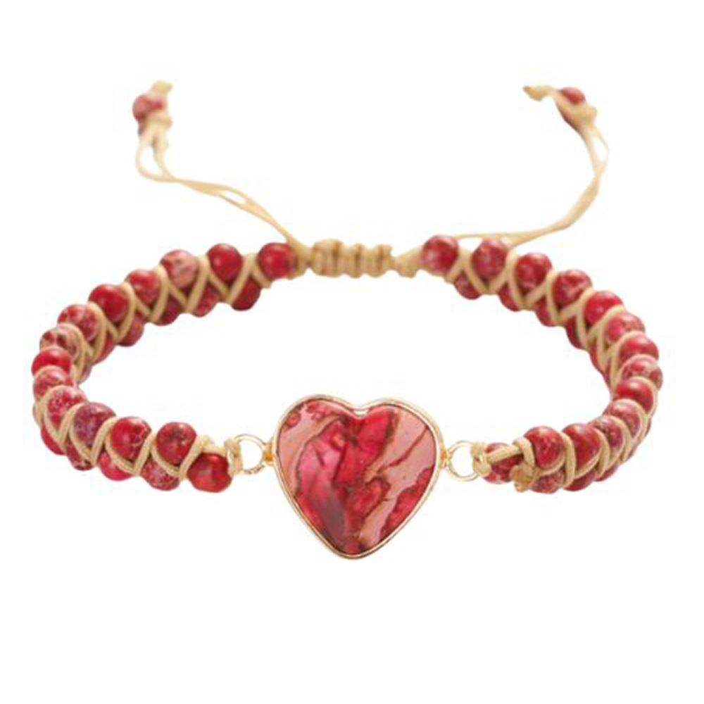 Deze subtiele vegan armband is handgemaakt en voorzien van rode ronde kralen en een hartvormige bedel vervaardigd uit natuursteen, met een goudkleurige omlijsting. De ronde kralen zijn geregen op een verstelbaar lichtbruin waxcord. Een trendy aanvulling op je outfit! Een chique armband met een glanzend effect.