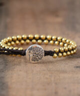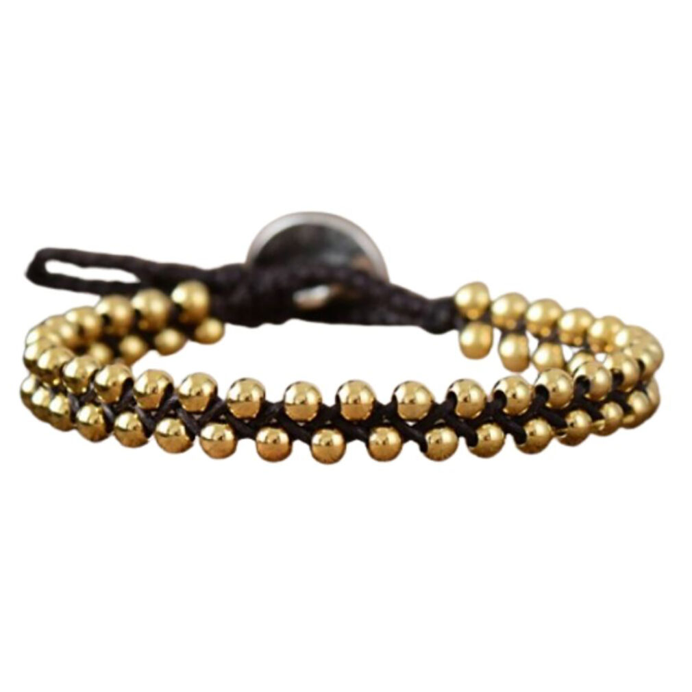 Deze prachtige handgemaakte armband is vervaardigd van geweven leer en goudkleurige zinklegering kralen. Vanwege het tijdloze design past hij perfect bij iedere dames outfit! Door zijn knoopsluiting is hij gemakkeijk en comfortabel in gebruik. De armband heeft een trendy goudkleurige knoopsluiting waarop het symbool van de “Tree Of Life” staat afgebeeld. Deze handgemaakte armbanden zijn stuk voor stuk uniek!