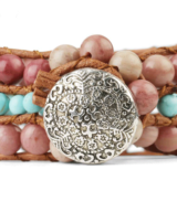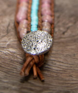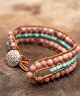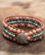 Deze schitterende armband is handgemaakt van leer en edelstenen. De kralen zijn vervaardigd uit Rhodoniet ( roze ) en Turqoois (blauw). Een vrolijk design die gedragen kan worden door dames en heren.