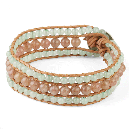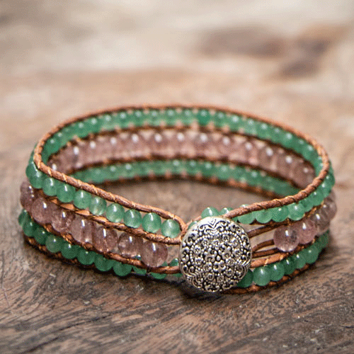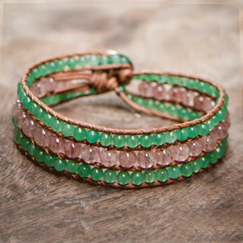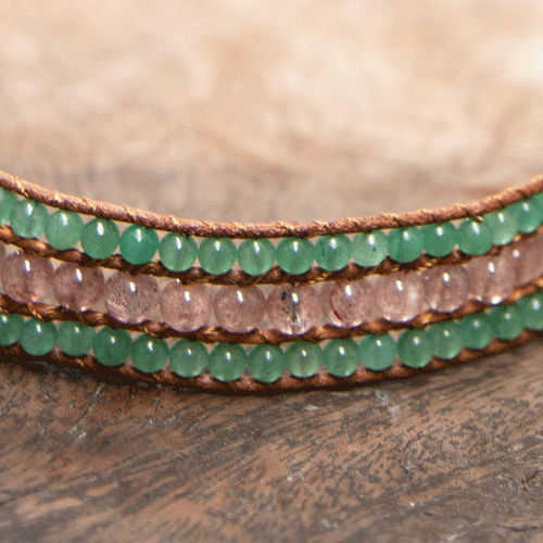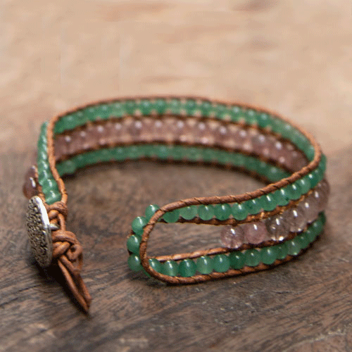 Deze schitterende armband is handgemaakt van leer en edelstenen. Zijn vrolijke kleuren zorgen ervoor dat je de armband perfect kan combineren met een dames of heren outfit. De kralen zijn vervaardigd uit Aventurijn ( groen ) en Kristal (roze).