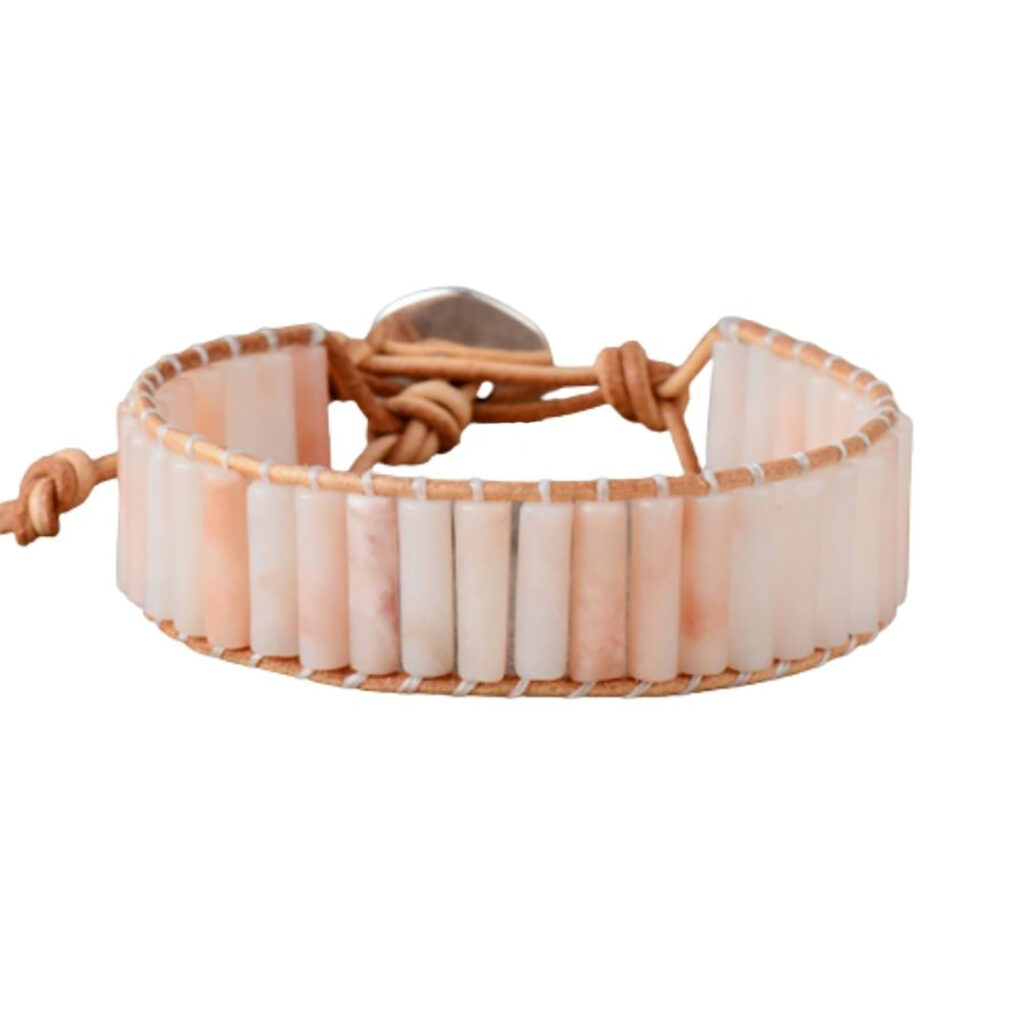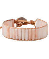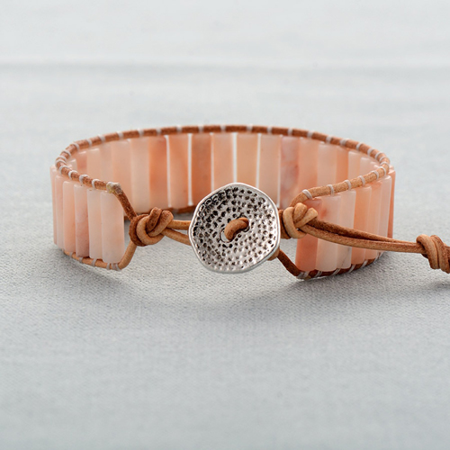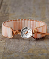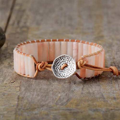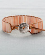 De prachtige armband is handgemaakt en voorzien van bruin leren koord en koraalkleurige Jade edelstenen. De armband is een mooie aanvulling op je outfit! Zachte tonen voor een mooie dames pols.