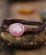 Deze prachtige vegan waxcord armband is voorzien van de edelsteen Rhodoniet. Elegant door het subtieledesign en perfect voor iedere dames outfit. Het koord van de armband is 80 cm lang en heeft 3 sluitingen, dus one size fits all! Je draait het waxcord een aantal keer om je pols voor een mooi wikkel-effect. De steen heeft allerlei kleuren bij verschillende lichtinvallen, zoals roze en zachtpaars. Verras jou partner met deze prachtige armband. Geleverd in een luxe geschenkdoos.
