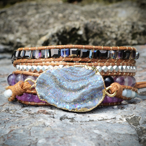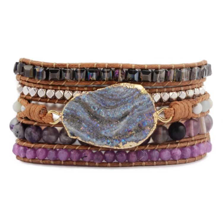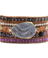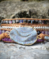 Deze prachtige handgemaakte armband is gemaakt van leer en edelstenen. Door zijn neutrale kleuren past hij perfect bij iedere dames of heren outfit! De armband heeft een mooie Galaxy Quarts edelsteen. Galaxy Quarts is een prachtige steen met een ruwe uitstraling. Leuk om te dragen tijdens een feestje. Wordt geleverd in een luxe geschenkdoos.