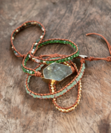 Deze schitterende armband is handgemaakt van leer en edelstenen. De grote steen is een zachtgroene Aventurijn. Verdwijn in de kleuren van deze prachtige dames en heren armband. De armband past 5x om je pols.