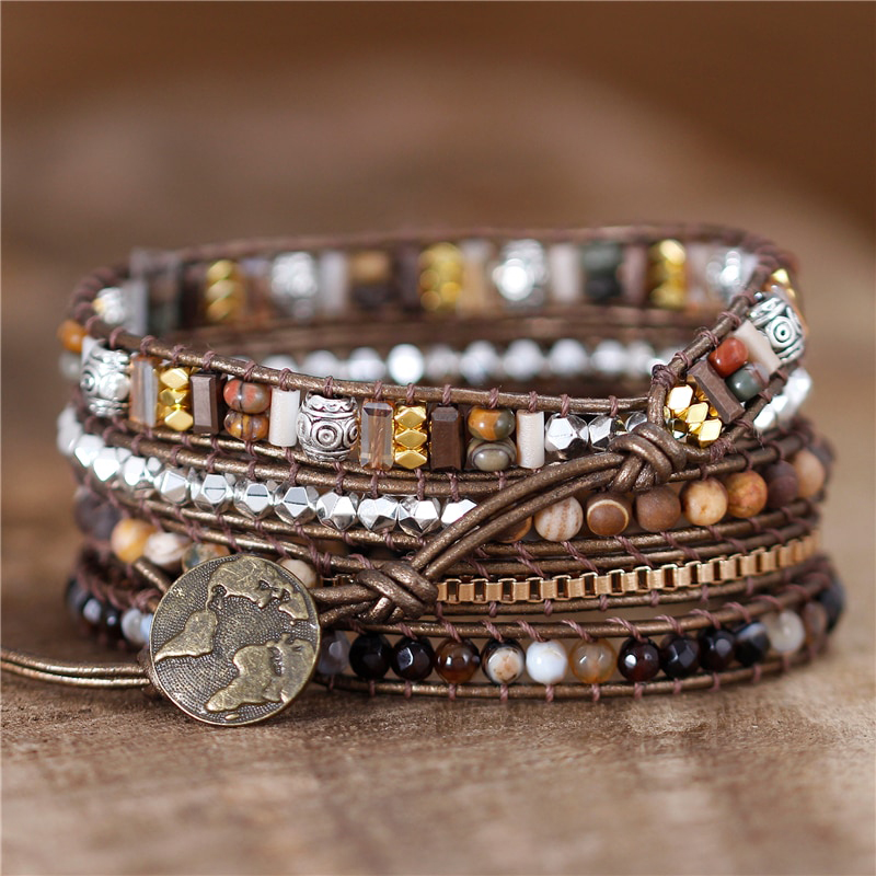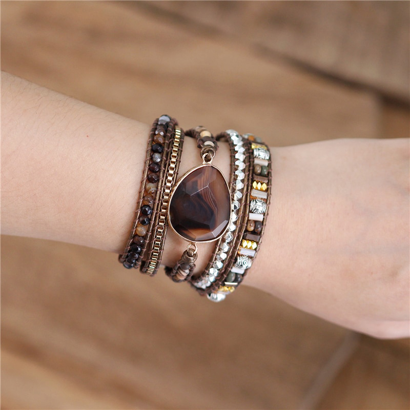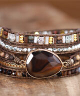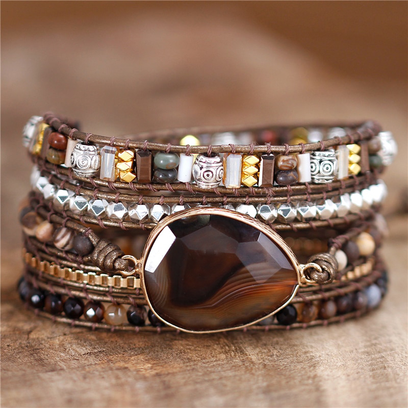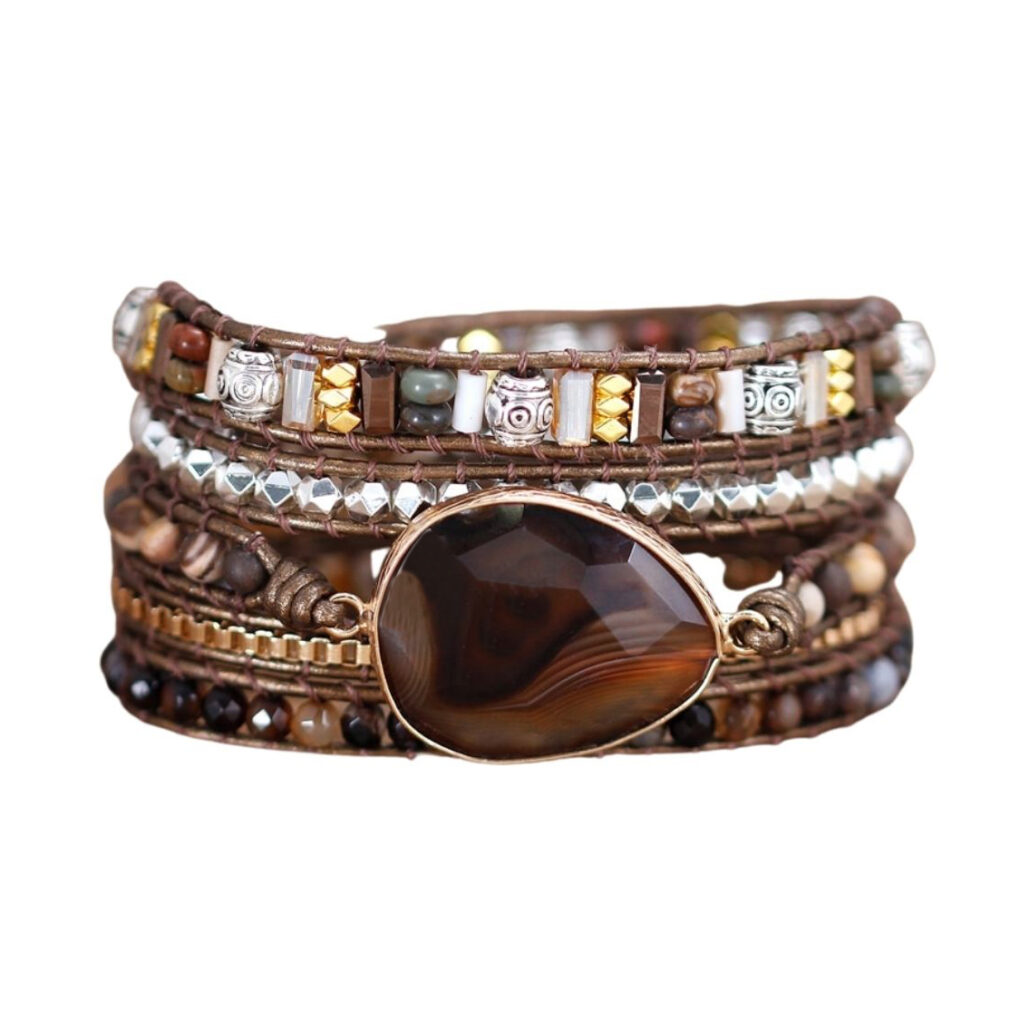 De prachtige armband is handgemaakt en voorzien van lichtbruin leren koord en bruine agaat edelstenen. De armband is een mooie aanvulling op je outfit! Een natuurlijke uitstraling die iedere man en vrouw laat stralen.