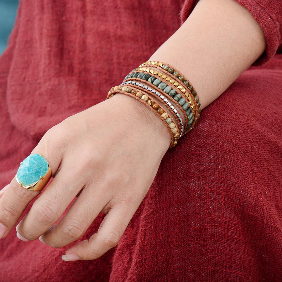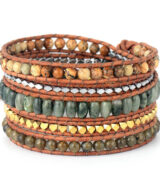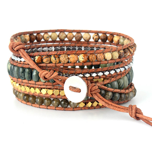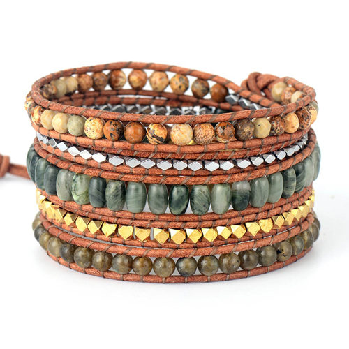 Deze trendy wikkelarmband past perfect bij iedere zomer outfit! Deze Ibiza style armband is gemaakt van kleine kralen, edelstenen zoals labradoriet en jaspis, en leer. De armband is enorm leuk om te geven of een mooi cadeautje voor jezelf!