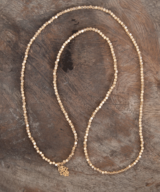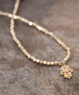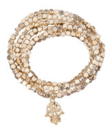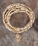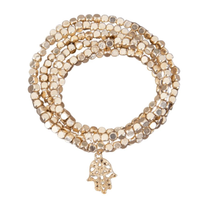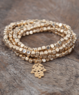 - goudkleurige metalen kralen en een bedel van een hamsa handje.