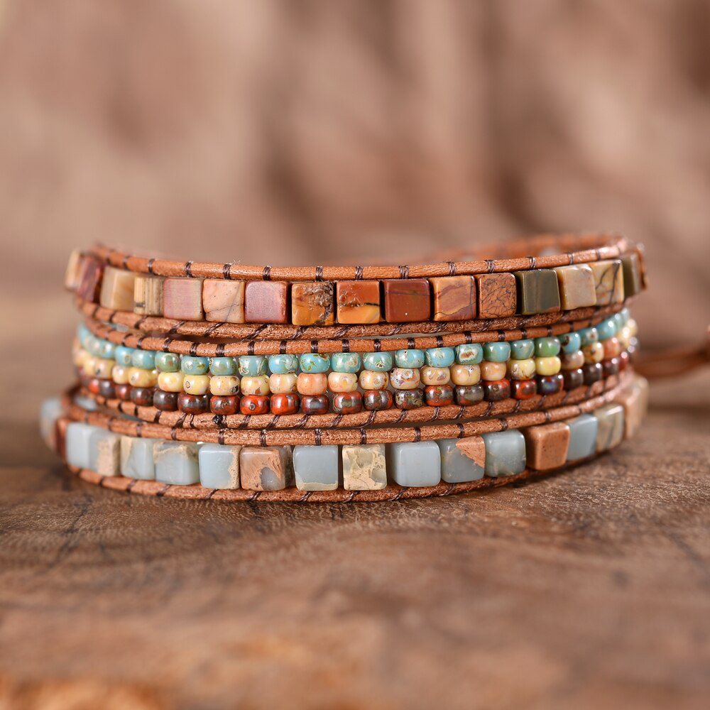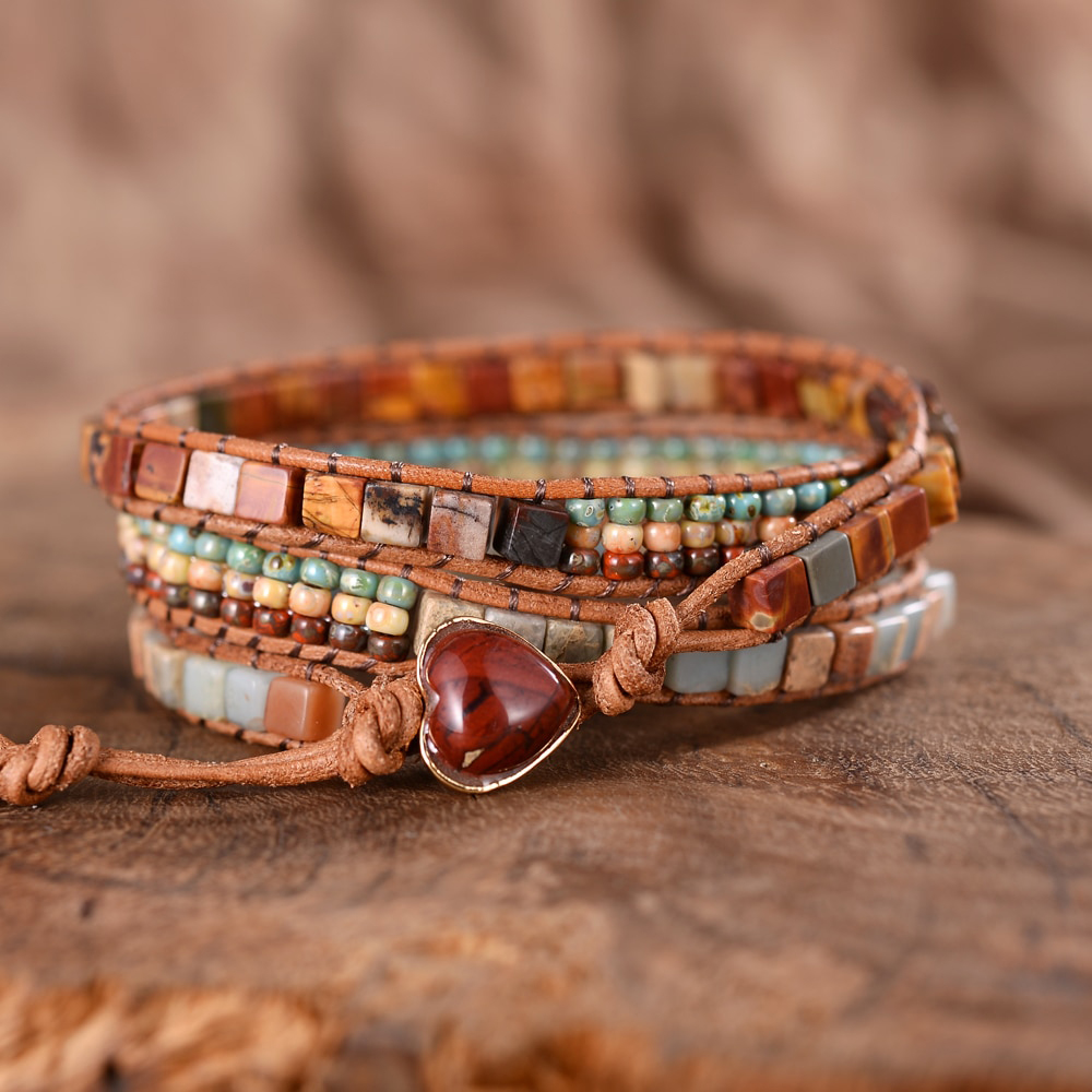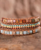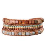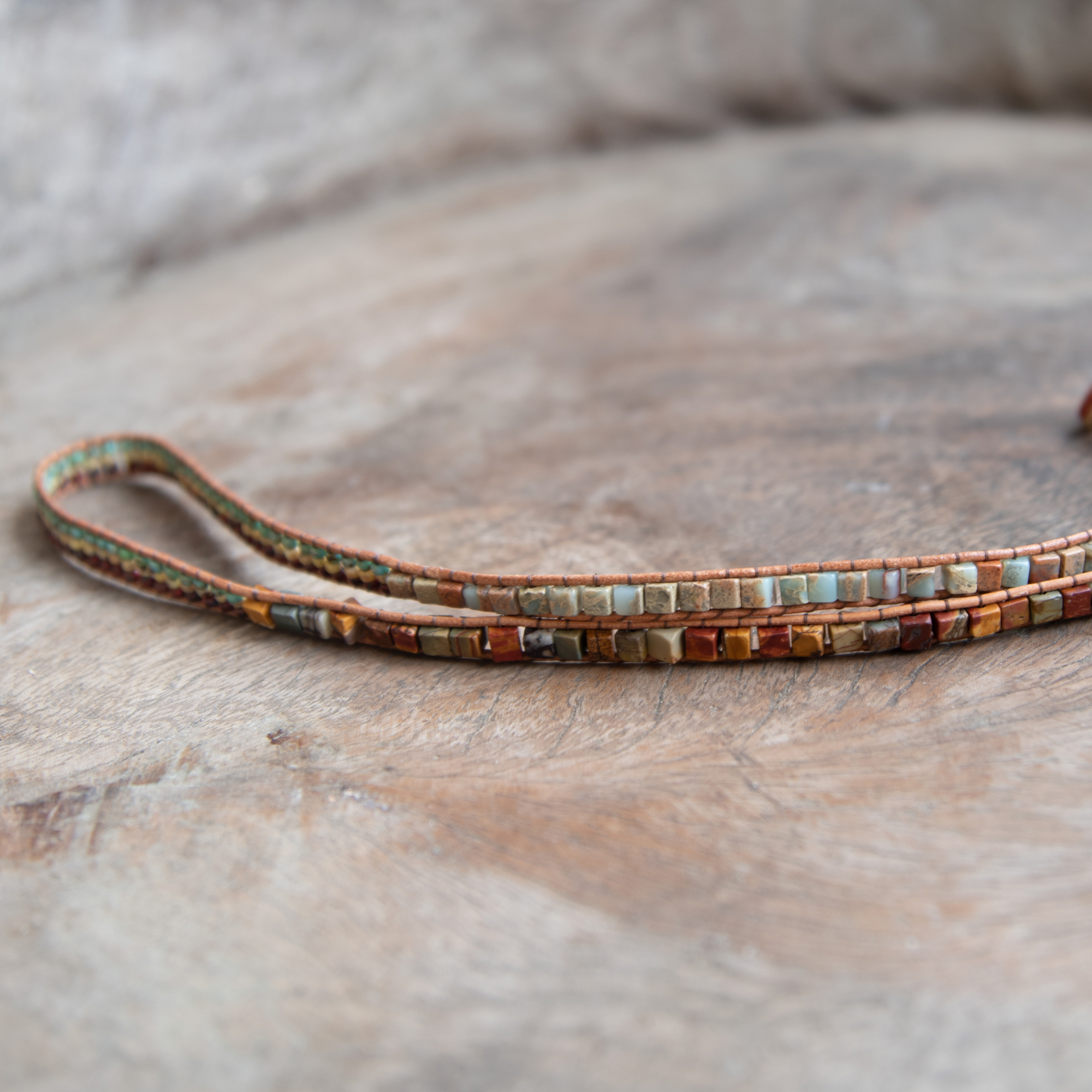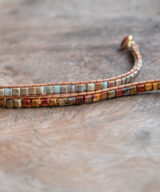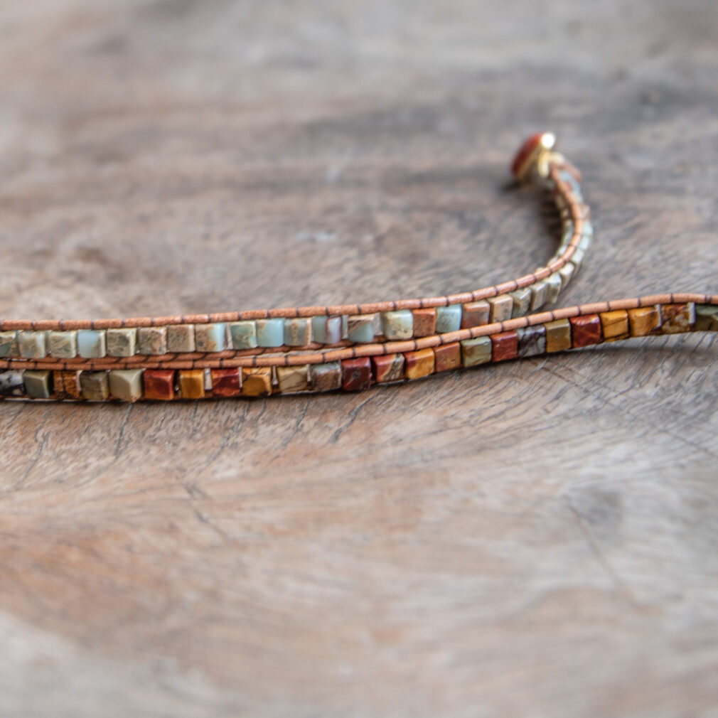 Deze trendy armband is handgemaakt en voorzien van bruin leren koord en vierkante jaspis edelstenen in aardetinten. De kleine ronde kralen zijn vervaardigd kristal en jaspis. De armband is een mooie aanvulling op je outfit! De armband beschikt over een knoopsluiting in de vorm van een hartje.