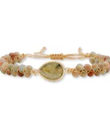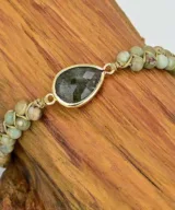 De hoofdsteen van de armband is een schitterende druppelvormige edelsteen van labradoriet, omgeven door een verfijnde gouden rand. Labradoriet staat bekend om zijn magische kleurenspel en wordt vaak geassocieerd met positieve energie en bescherming. De edelsteen zorgt voor een unieke uitstraling die elke armband speciaal maakt.