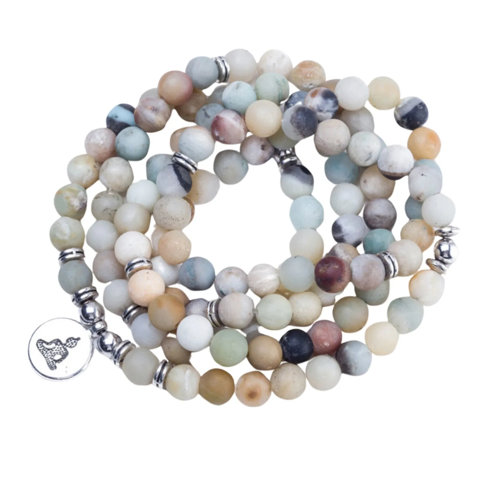Deze stijlvolle Mala armband is voorzien van een zilverkleurige hanger met daarop een Buddha. De armband is handgemaakt van elastisch koord en de edelstenen Amazoniet in verschillende tinten bruin en blauw. De armband kan 4x om je pols maar kan ook als ketting worden gedragen. Deze Mala armband heeft 108 kralen dus kan ook worden gebruikt tijdens het mediteren.