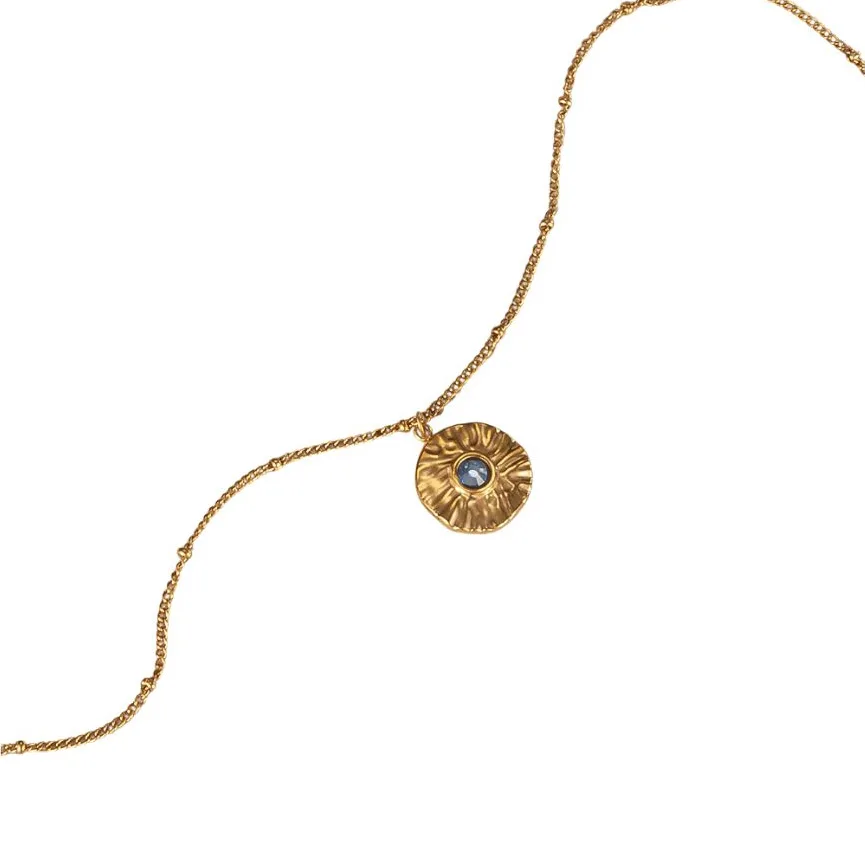 De ronde hanger met ingegraveerde bloem en blauwe, glinsterende strass steen straalt een tijdloze charme uit en voegt een vleugje glamour toe aan elke outfit. Of het nu voor een romantisch diner is of gewoon als dagelijkse herinnering aan jullie liefde, de Marama ketting “Aivy” is het perfecte cadeau voor bijvoorbeeld Valentijnsdag of een verjaardag.
