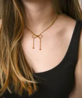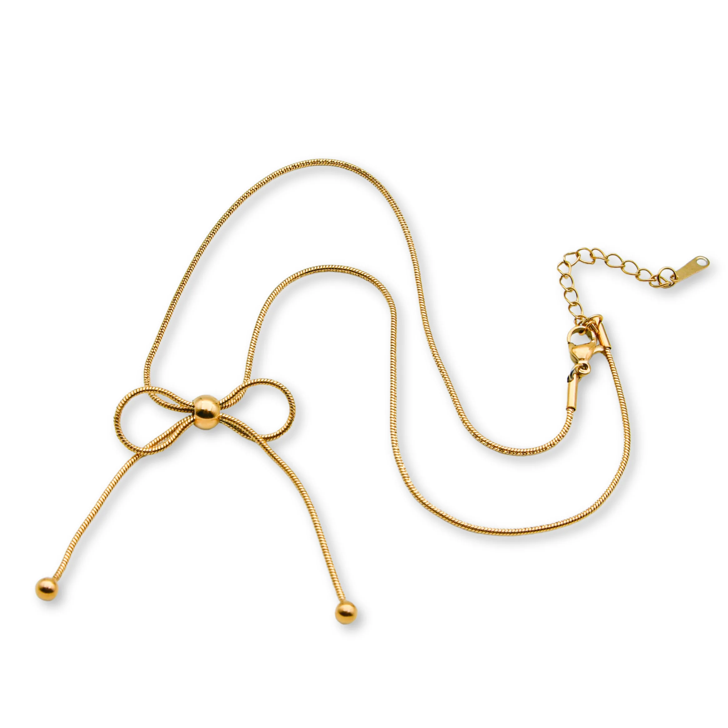 Deze verfijnde damesketting is een perfecte combinatie van elegantie en eenvoud. De hanger in de vorm van een strikje, met prachtige gedetailleerde lussen, straalt vrouwelijke charme uit en past bij elke outfit. Gemaakt van hoogwaardig stainless steel, afgewerkt met een duurzame 18K gouden vergulding, is deze ketting niet alleen stijlvol maar ook verkleur- en afgiftevrij.