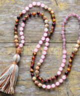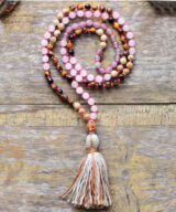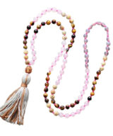 Deze prachtige Mala ketting met edelstenen en een kwastje is een trendy sieraad, maar uiteraard ook zeer geschikt om te gebruiken tijdens het mediteren.