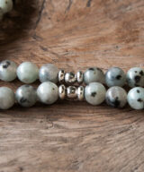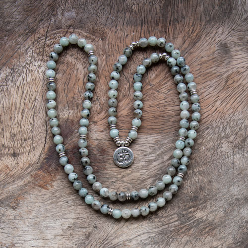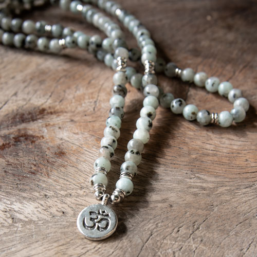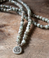 Deze prachtige Mala ketting met edelstenen en een zilverkleurige Ohm hanger is een trendy sieraad, maar uiteraard ook zeer geschikt om te gebruiken tijdens het mediteren.