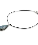 Voeg een krachtig en stijlvol accessoire toe aan je outfit met deze unieke herenketting. Gemaakt van zwart leer en voorzien van een hanger met een druppelvormige edelsteen van labradoriet in prachtige blauw-grijze tinten. Deze ketting is perfect voor de moderne man die een robuuste en toch verfijnde uitstraling zoekt. De zilverkleurige metalen sluiting met een karabijnhaakje zorgt voor gebruiksgemak en veiligheid. Dankzij het verstelbare ontwerp draag je de ketting precies zoals jij wilt.