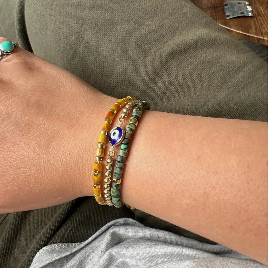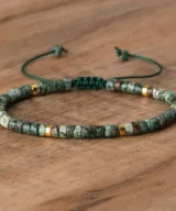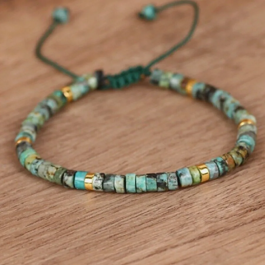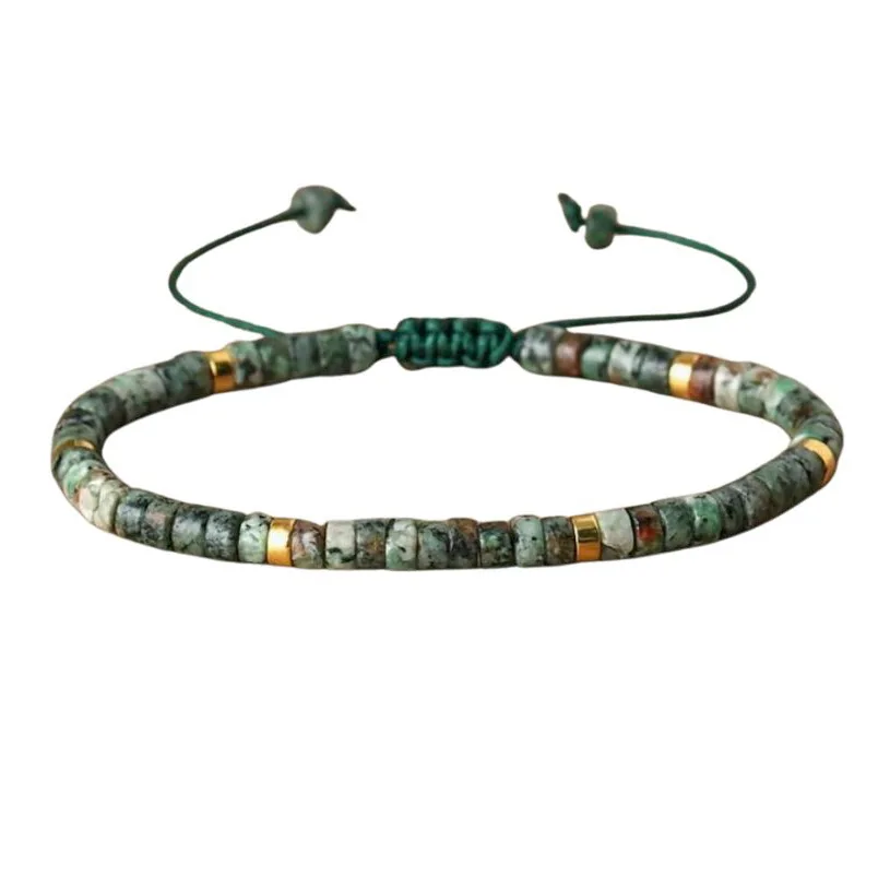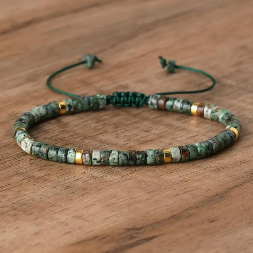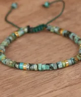 Deze stoere handgemaakte vegan armband van groen waxcord en groen gemêleerde edelstenen (Afrikaanse Turquoise) heeft een een verstelbare treksluiting. Als mooi contrast beschikt de armband over goudkleurige kralen van metaal. Deze trendy herenarmband heeft een treksluiting, dus one size fits all!
