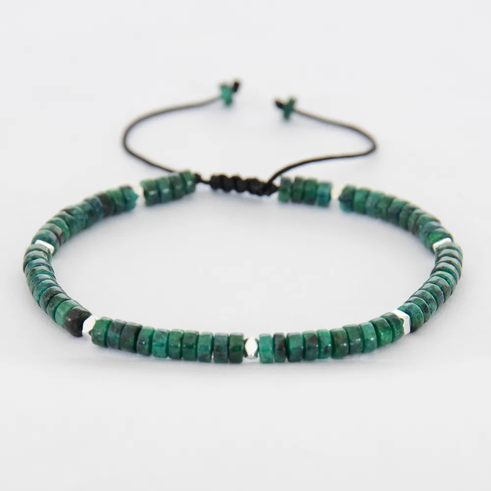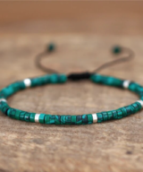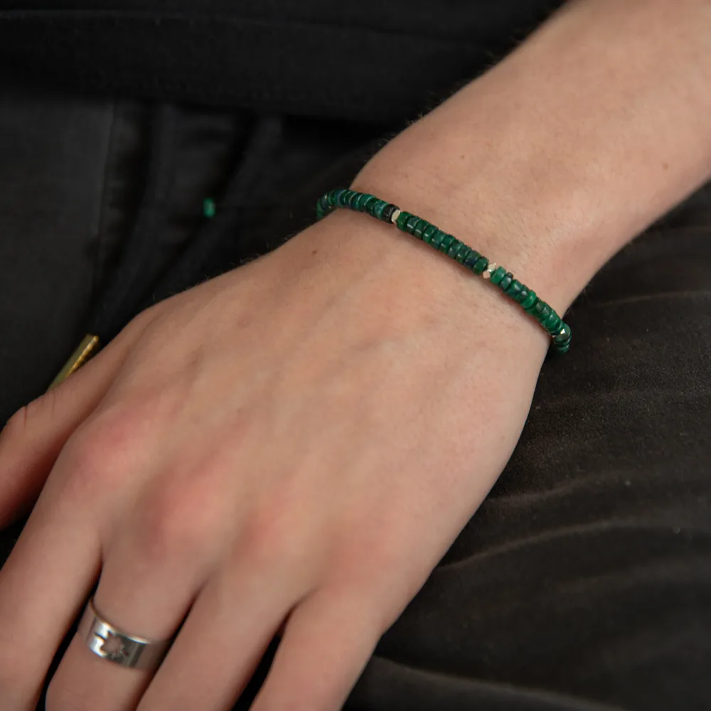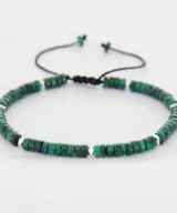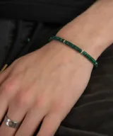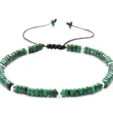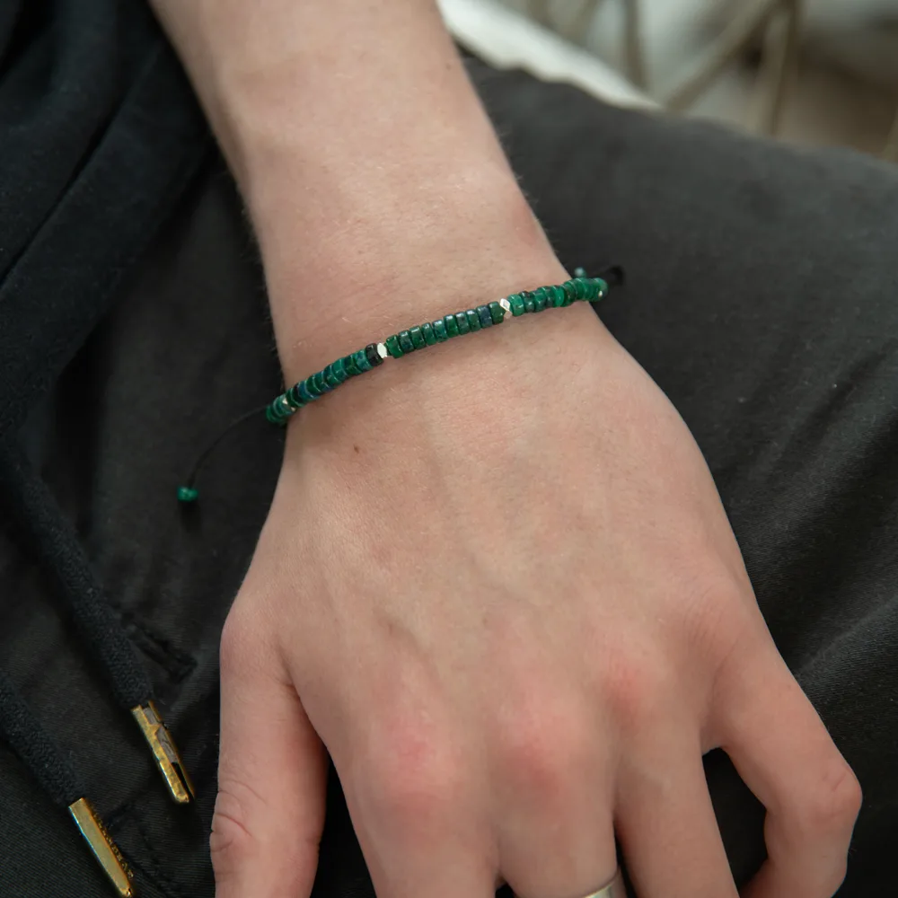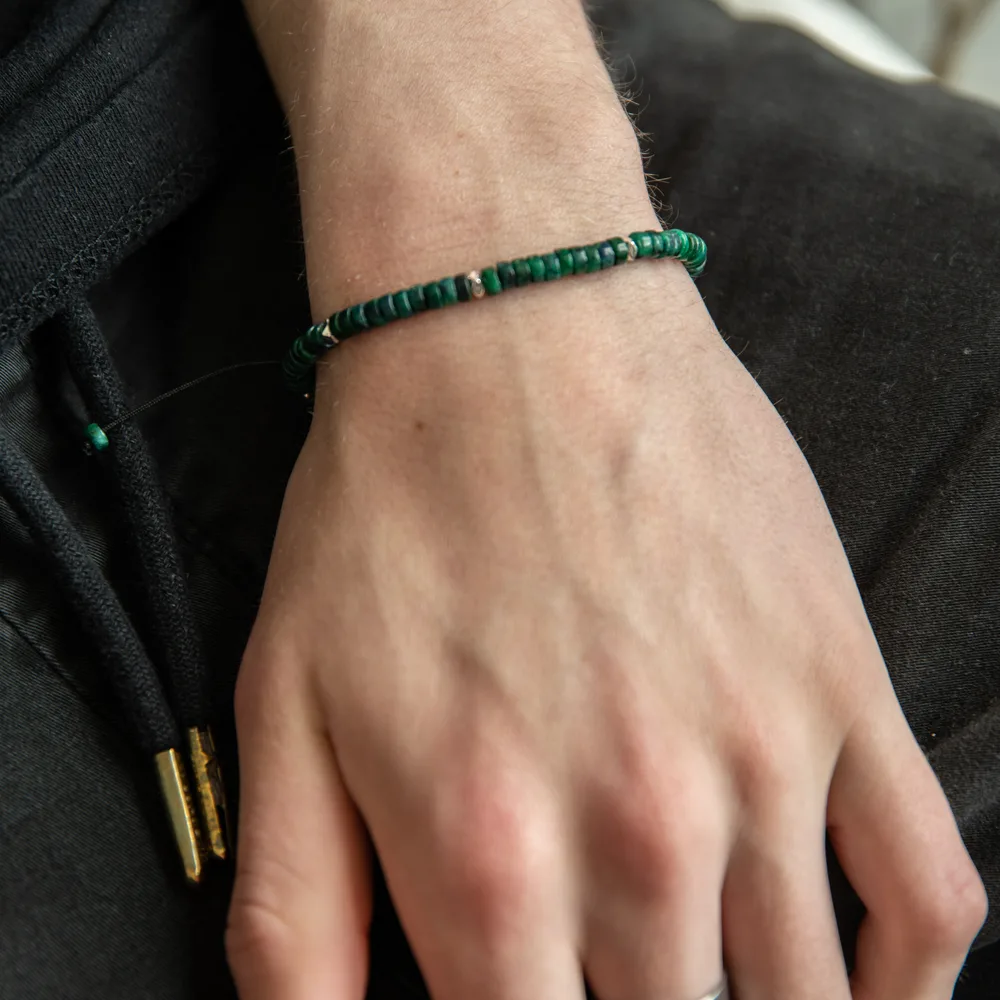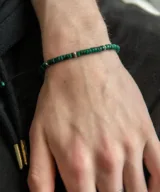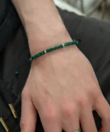 Deze stoere handgemaakte vegan armband van zwart waxcord en donkergroen gemêleerde edelstenen (Malachiet) heeft een een verstelbare treksluiting. Als mooi contrast beschikt de armband over zilverkleurige kralen van metaal. Deze trendy herenarmband heeft een treksluiting, dus one size fits all!