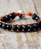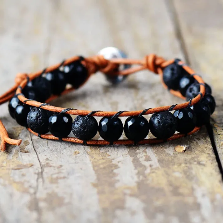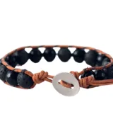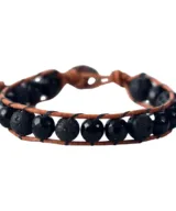 Deze stoere handgemaakte armband van bruin leer, zwarte Onyx edelstenen en Lavasteen heeft een een verstelbare knoopsluiting. De armband is geschikt voor mannen en vrouwen. Draag de armband met meerdere armbanden uit deze serie voor een mooi effect, of draag hem subtiel als enkele armband om je pols. Leuk om cadeau te geven. Wordt geleverd in een luxe geschenkverpakking.