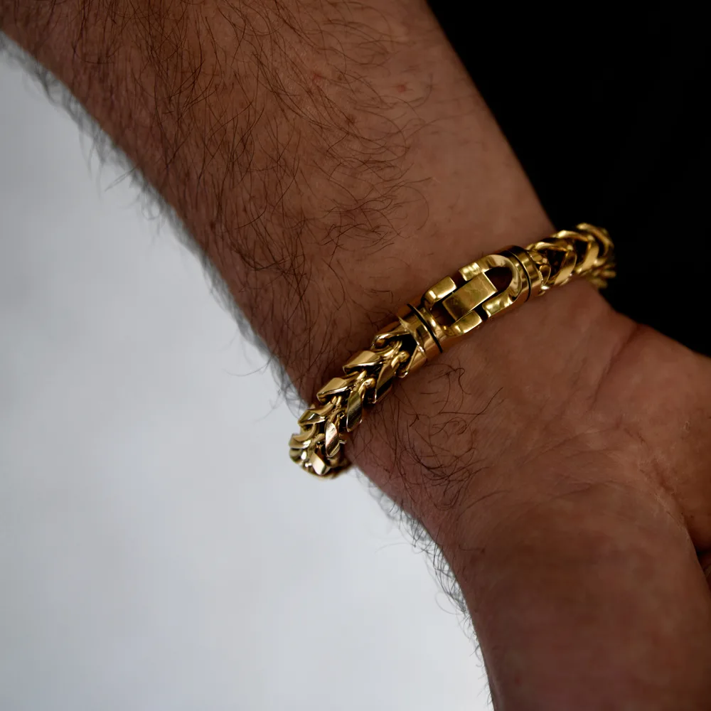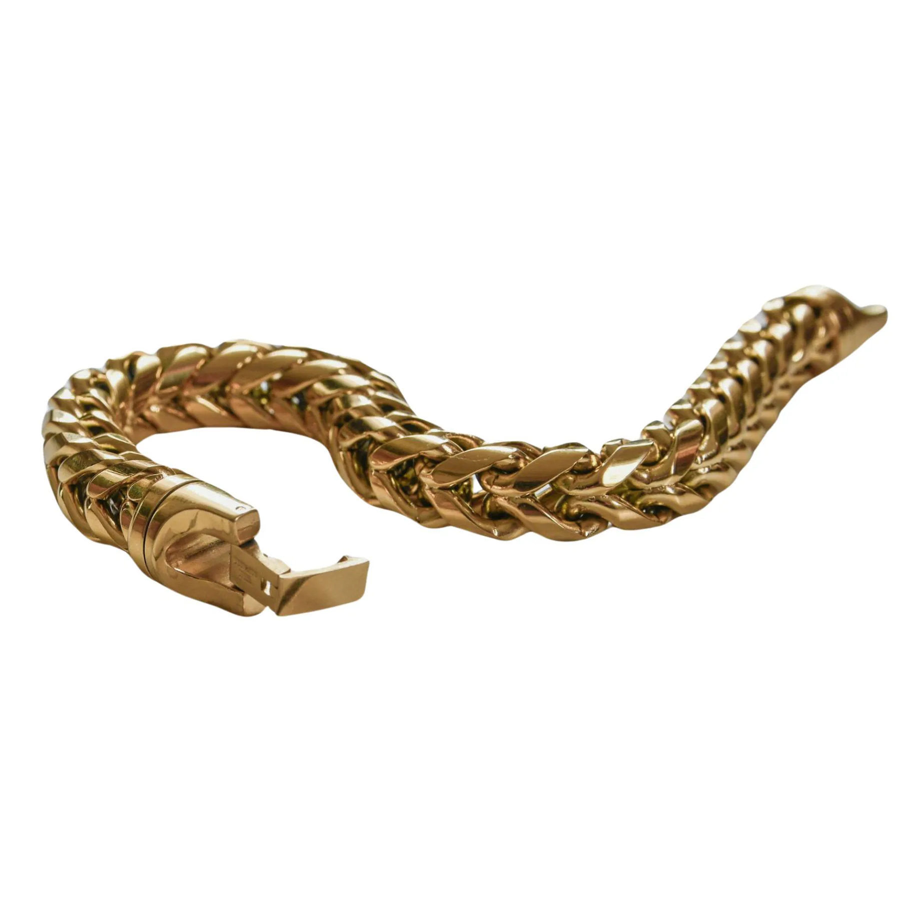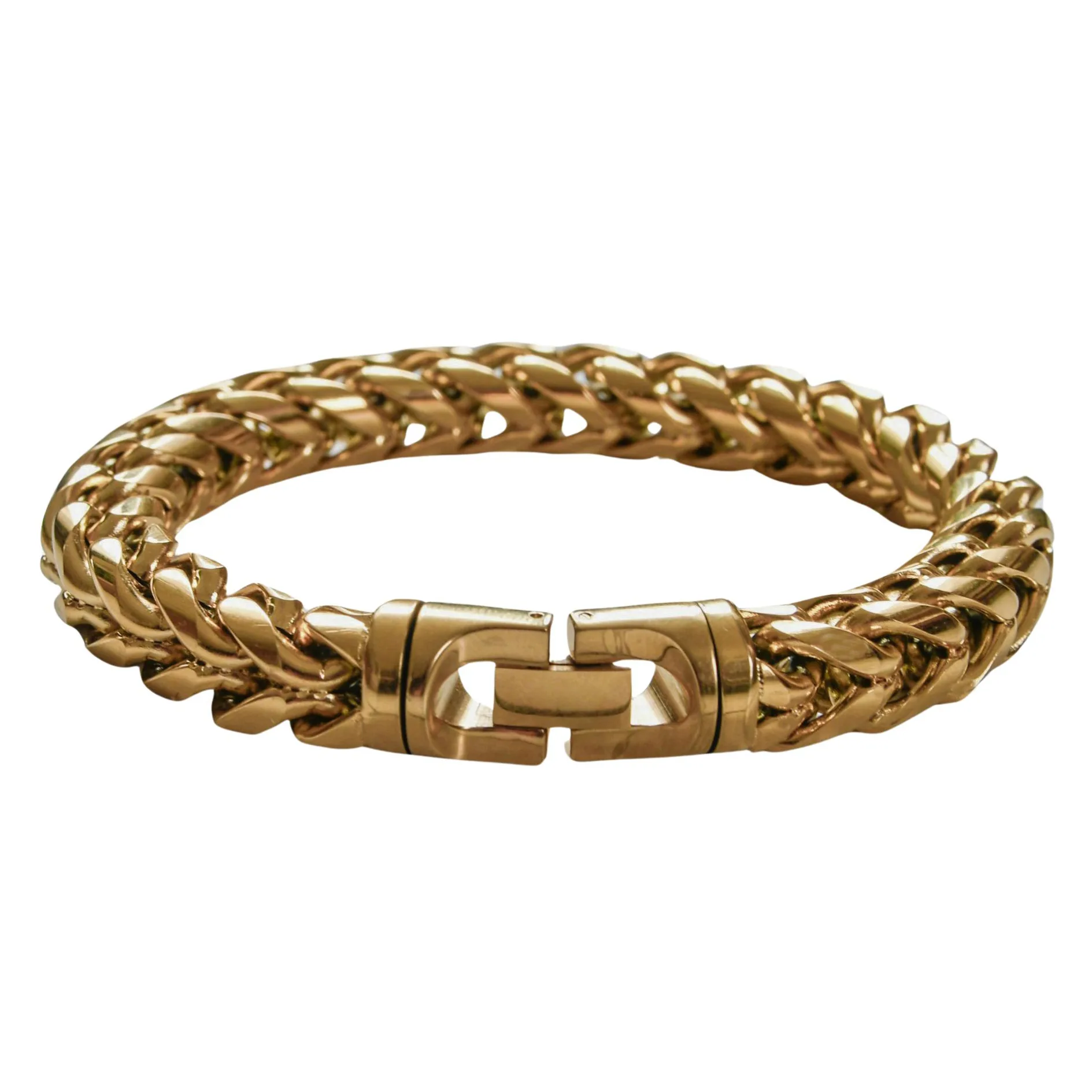Ontdek de stoere en robuuste Viggo herenarmband, een perfecte keuze voor mannen die op zoek zijn naar een accessoire van hoogwaardige kwaliteit. Deze armband is gemaakt van duurzaam roestvrij staal en afgewerkt met een luxueuze goud plating, wat zorgt voor een tijdloze uitstraling. De franco schakel voegt een extra dimensie van stijl toe, terwijl de stevige sluiting ervoor zorgt dat de armband altijd veilig om je pols blijft zitten. De brede, mannelijke vormgeving van de Viggo armband maakt het een perfecte keuze voor elke moderne man die zijn outfit wil versterken met een krachtig statement. Perfect voor elke gelegenheid, van casual tot formeel.