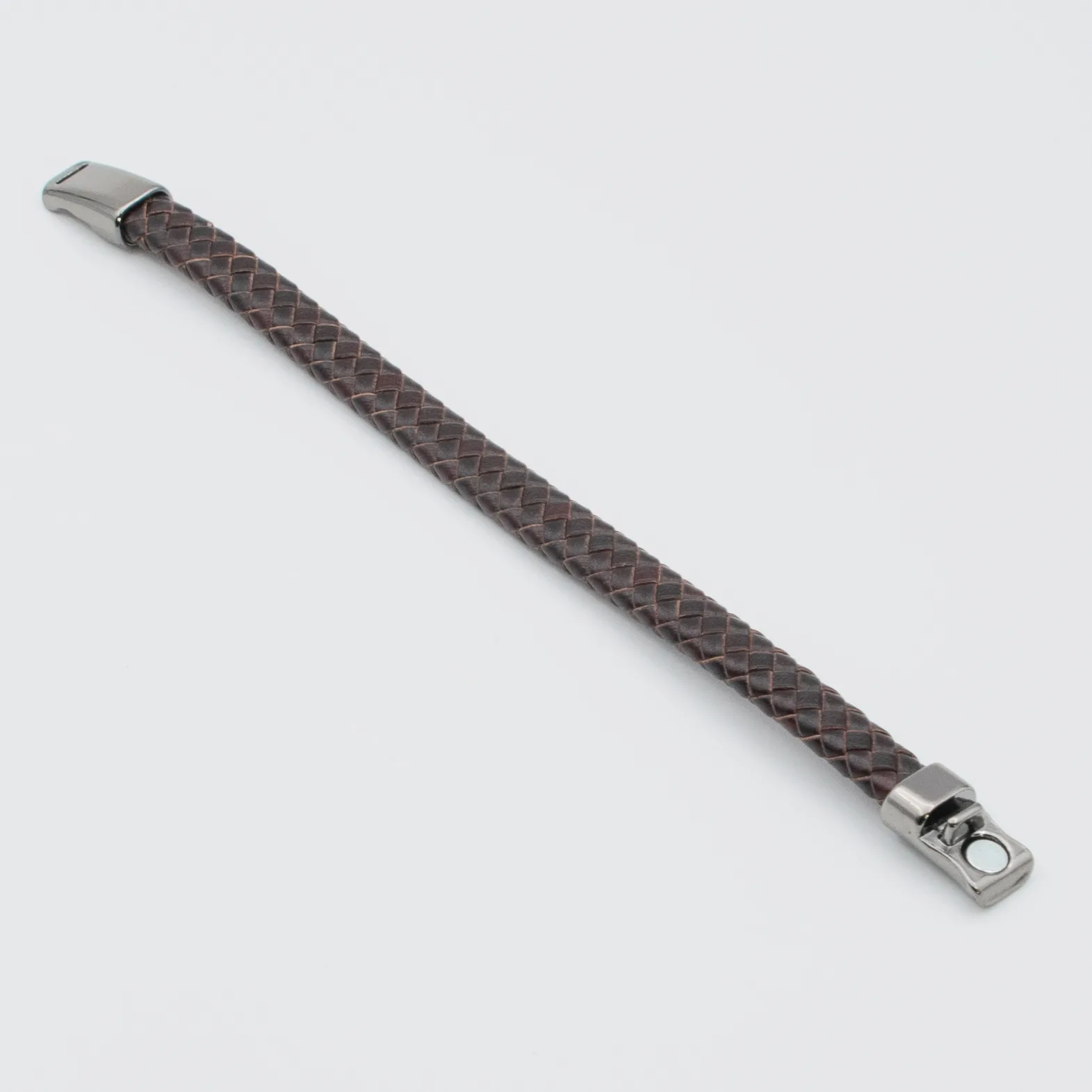 De armband is voorzien van een stevige magneetsluiting, waardoor hij eenvoudig en veilig om de pols blijft zitten. Deze magneetsluiting heeft een elegante afwerking in gun metal zilver, die een vleugje luxe toevoegt aan de armband. De combinatie van het robuuste leer en de zilveren sluiting maakt deze herenarmband een perfecte keuze voor elke gelegenheid, of het nu casual of formeel is. Ideaal als cadeau voor mannen die houden van een stoere en stijlvolle uitstraling.