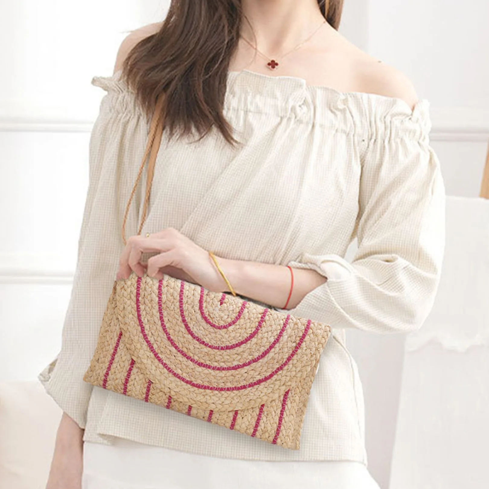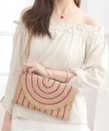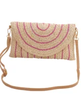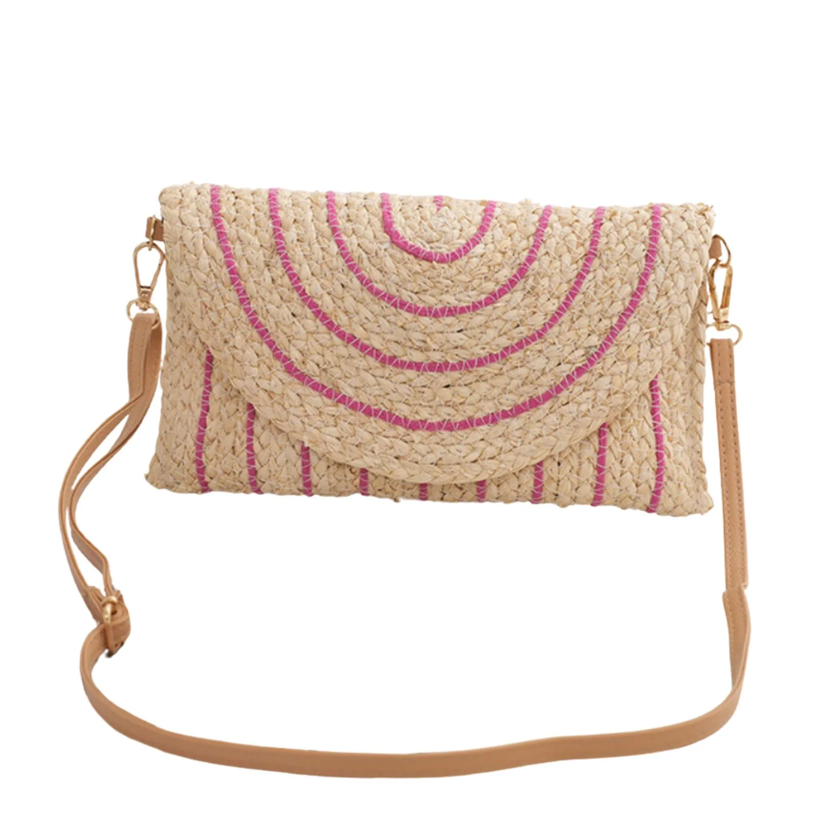 Deze zomerse tas is gemaakt van stro en heeft opvallende roze strepen die een vrolijke en speelse uitstraling geven. De tas is voorzien van een afneembare schouderband, waardoor je de tas zowel als schoudertas en clutch kunt dragen. Dit maakt het een veelzijdige accessoire dat zich aanpast aan elke gelegenheid, van een stranddag tot een avondje uit.