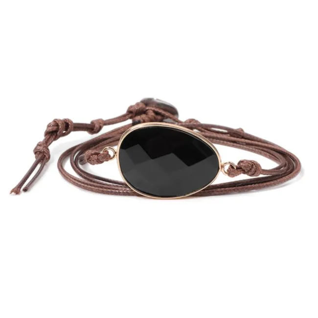 Wikkel Armband Edelsteen Zwarte Agaat Bruin Waxcord