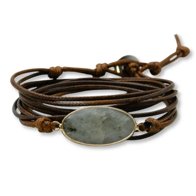 Wikkel Armband Edelsteen Labradoriet Ovaal Bruin Waxcord